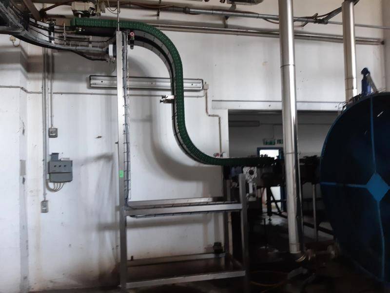 Upgoing conveyor. Product will be clamped between the two conveyor parts. Motor power 2x 1,1 kW. Upgoing height 170 cm. Product size easy adjustable to max 32 cm. Total dimensions: 80 x 220 x 350 cm.