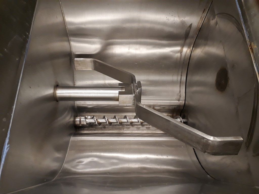 Powder dosing machine. Stainless steel infeed hopper of ± 100 ltr. Separate motor for outfeed screw and agitator. 2'' Outlet with outlet srew. Outlet height: 115 cm. Mobile mounted. Total dimensions: 140 x 65 x 230 cm.