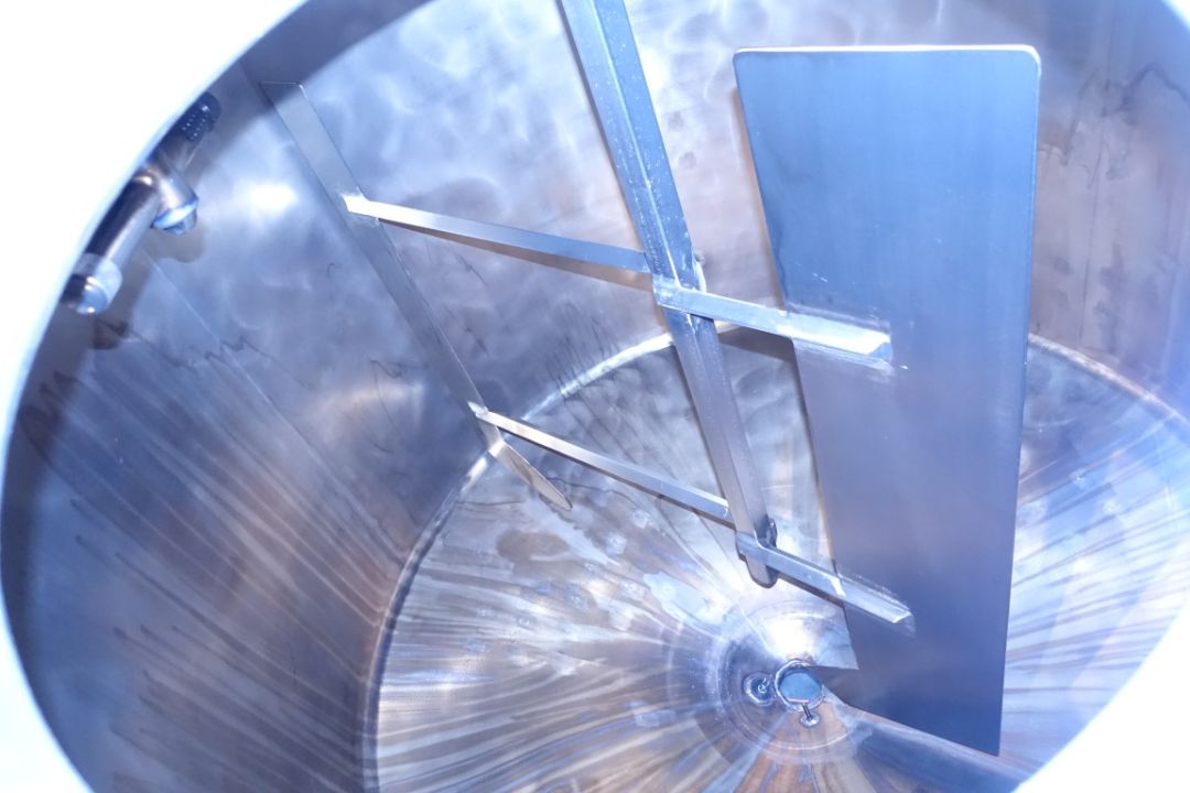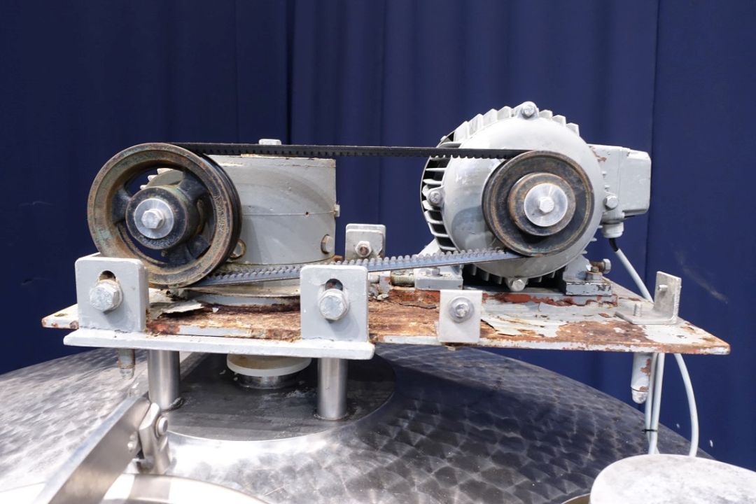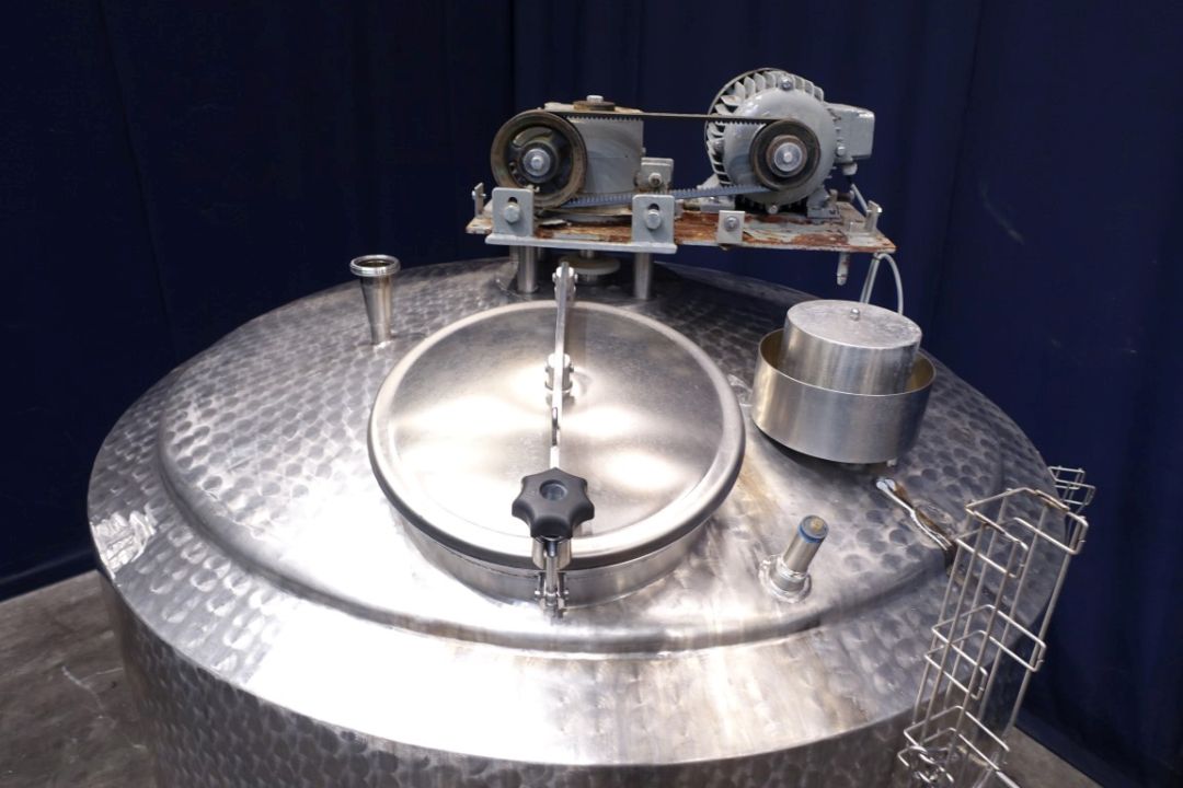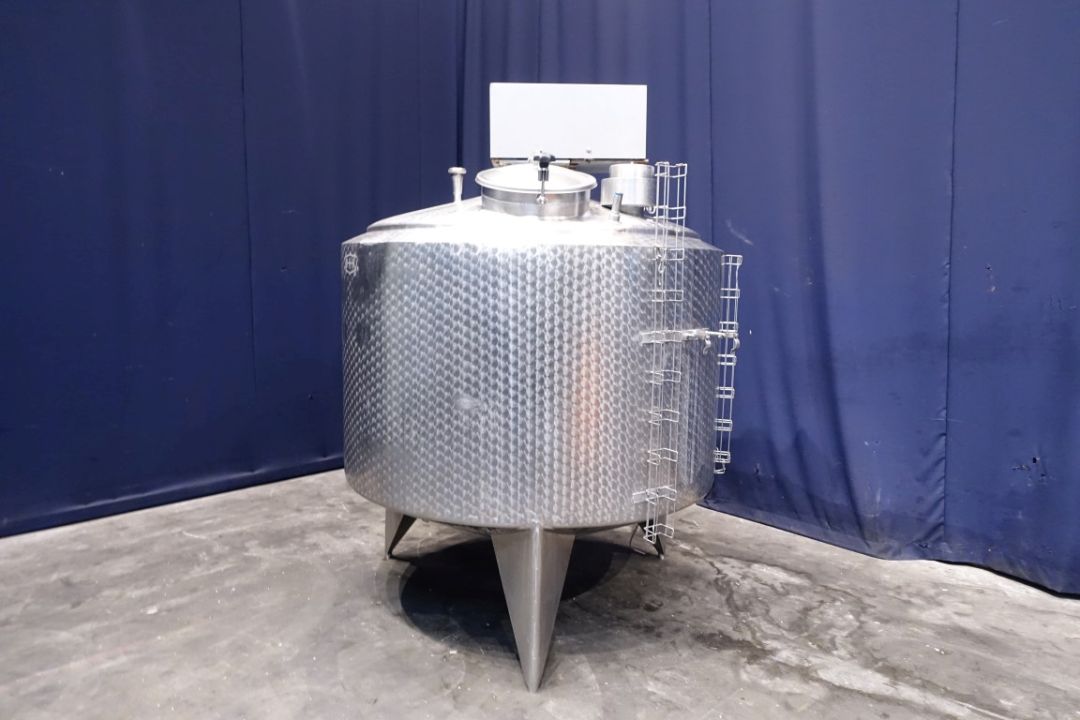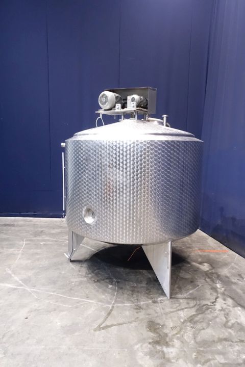 Double jacketed process tank. Top driven fenceagitator. Motor power: unknownInsulated side and bottom. Pressure in tank atmospherique. Conical. Connections for: PT-100 tempemperature sensor, pressure transmitter, high and low level. Breather. CIP spray bowl. Manhole in top. 3 Adjustable feet. Total dimensions: 1,80 x 1,80 x 2,40 mtr.