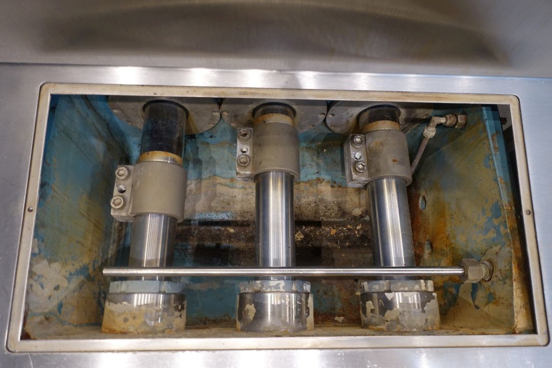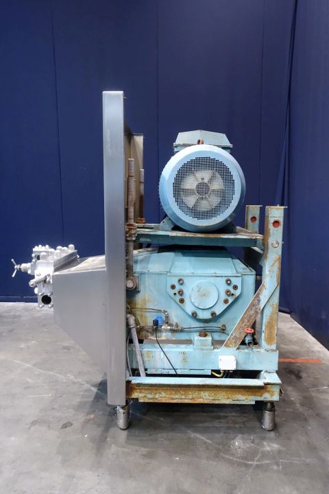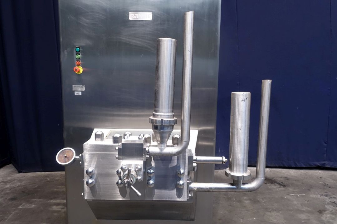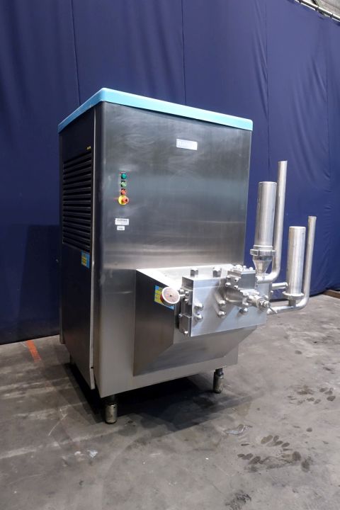 High pressure homogenizer. 1 Stage with manual pressure control. 3 Pistons, piston diameter: 58 mm and stroke is 79 mm. Stainless steel cladded. Inlet and outlet connections: 2’’. Current motor power: 55 kW and maximum pressure in current confirguration with this motor 200 bar. Including pulsation dampers, to avoid vibrations on inlet and outlet piping, overpressure valve, manometer. Excluding control panel. Including instruction manual and spare parts list in German. Total dimensions: 200 x 120 x 225 cm. Weight: 2.750 kg.
