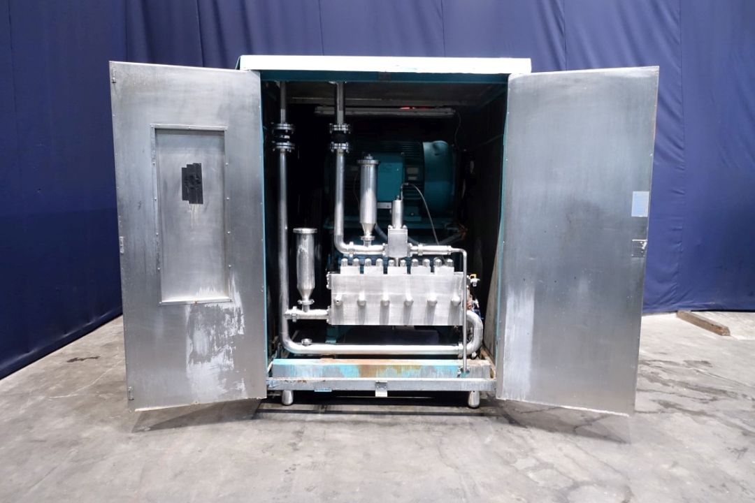 High pressure homogeniser. 1 stage with hydraulic pressure control. 5 Pistons, piston diameter: 58 mm and stroke: 90 mm. Stainless steel cladded in sound proof box < 80 dB (Rannie Milieu). Current motor power: 200 kW - 985 rpm and maximum pressure in current confirguration with this motor 200 bar. Overpressure valve. Electronic pressure transmitter. Pulsation demper on inlet and outlet. 2 Side inlet. Remote pressure control. Connections: 3''/3''. Control panel with Siemens S7-300 PLC. Total dimensions: 195 x 275 x 260 cm.