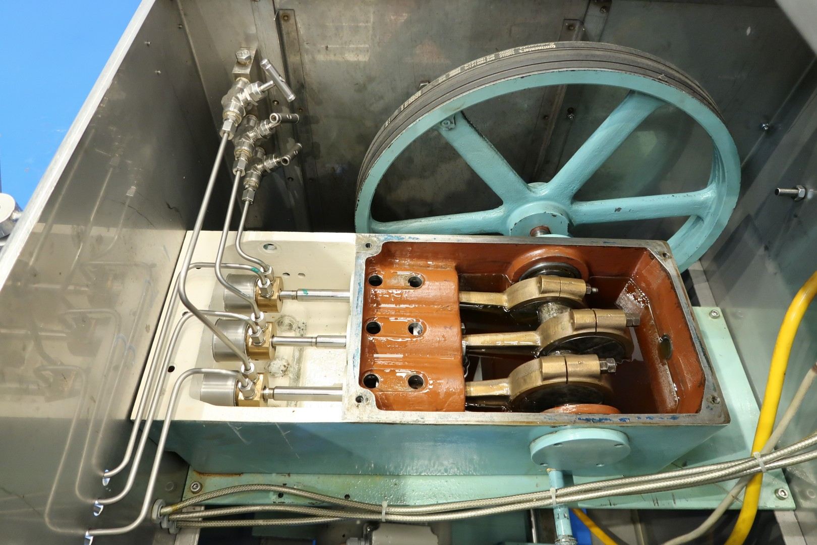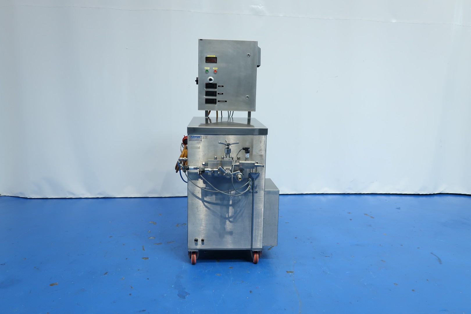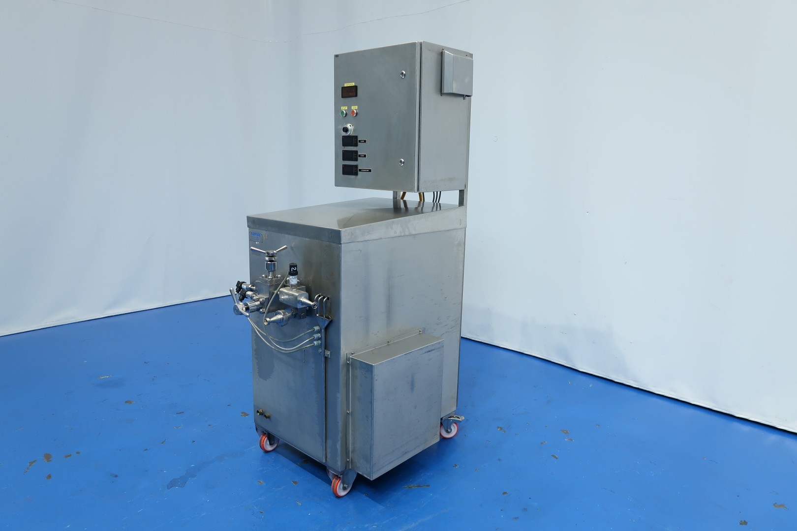 Pilot Homogenizer, laboratorium, 2 stage. Manual pressure control 1st and 2nd stage. Piston diameter 16 mm - stroke: 50 mm. With 2 pressure sensors, pressure indication via display. Motor: 4 kW - 8,2 A - 1.440 rpm. Operational contol panel with frequency convertor directly on frame. Speed manual adjustable via control panel and rpm indication via display 10-200ltr/h. pressure up to 375 bar. Documentation available. Total dimensions: 110x70x180 (lxwxh) cm - weight: 307 kg.