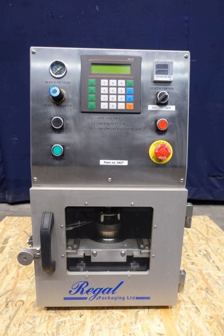 Regal Packaging LTD 22000. Laboratory Cup sealer with vacuum and gasflush. PLC controlled, possible to vacuum, gasflush and seal 1 cup at a time. Machine condition: good. Total dimensions: 54x45x72 (lxwxh) cm.