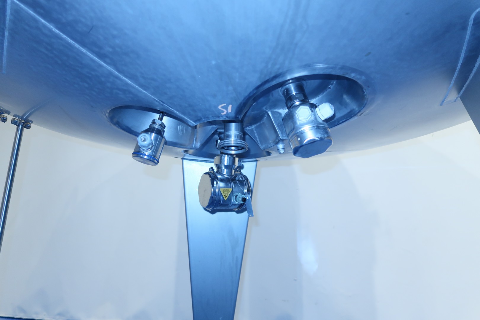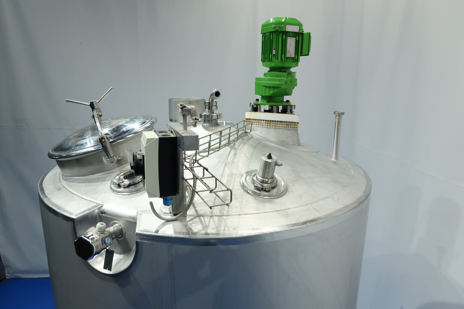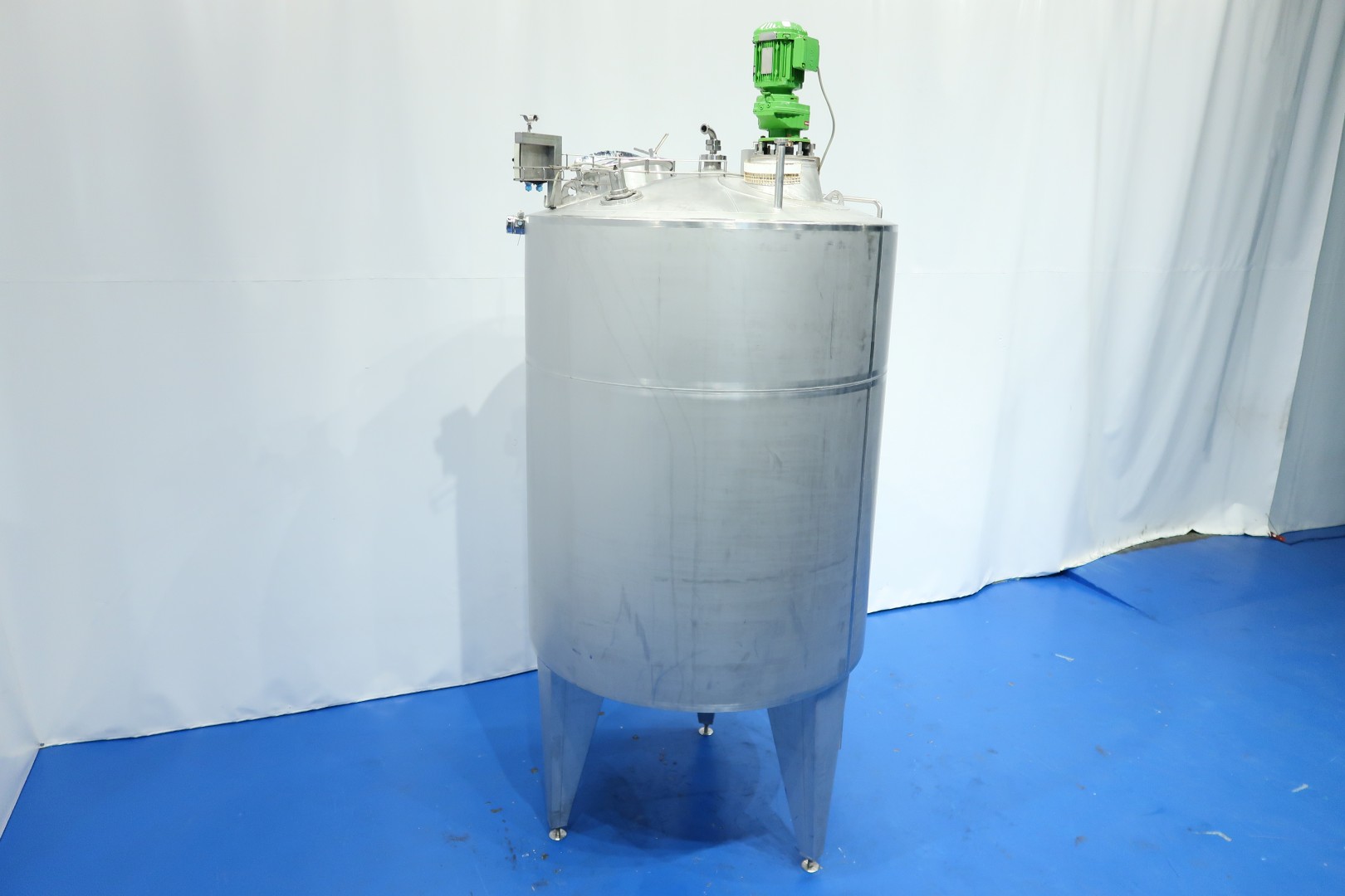 Insulated tank. 2 x Cip spray bowl (1 high and 1 low). With propellor agitator, motor 1,1 kW - 2,45 A -313 rpm - 50 Hz. Max temperature: 85 °C. With level sensor, high and low. With pressure transmitter and temperature transmitter in bottom. On top breather, lamp. Manhole in top round diameter 42 cm. 3 adjustable feet, cylindrical height: 184 cm. Outlet connection: 1,5" Din. Total dimensions: 170x160x355 (lxwxh) cm - weight: 620 kg.