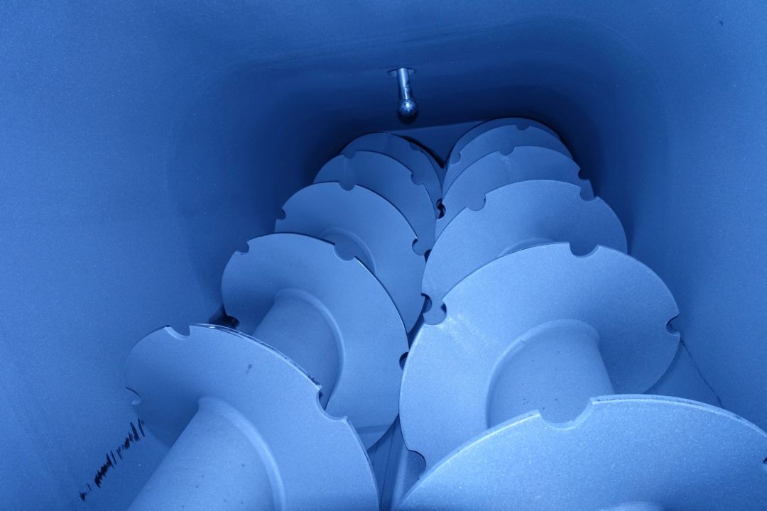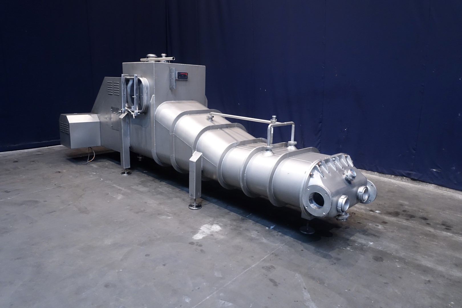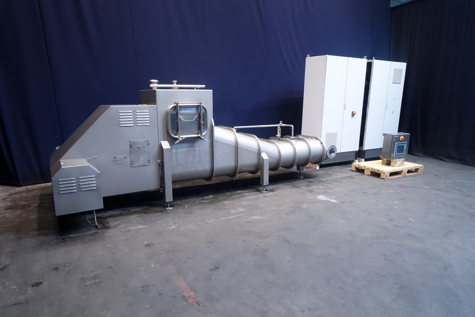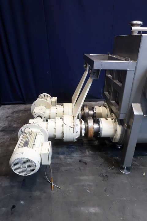 Reworker without front plate mixer. Reworker for pre-conditioned butter (+ 4...8°C) not for frozen butter. Volume: 1.950 liter. Worms: 2 x 400 mm diameter. Power: 2 gearbox motors, each 11 kW, 400 V. Sprayballs: 4 pcs. (each 8/12 m3/h). Material: Stainless-Steel 1.4301. 2x Control cabinets for Reworker with MCC, frequency converter and Siemens S7-300 PLC, operator panel cabinet for reworker with Siemens HMI-Touchscreen. Total dimensions: 450 x 180 x 172 cm. Weight: 2,400 kg. Will be sold in combination with 1 or 2 pinmixers, STN14909 + STN14910.