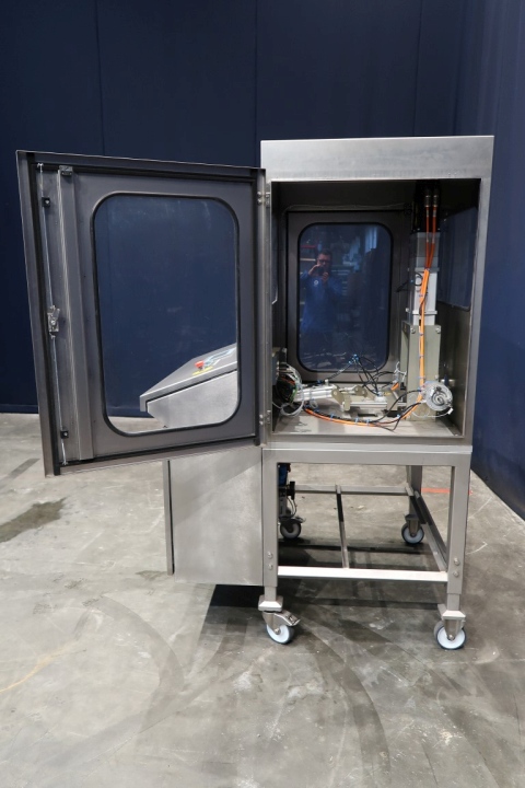 Unused experimental machine for forming and pressing Edammer cheese to small cheese balls (in combination with vacuum filler, which is excluded) by mold principle. including servo motors, siemens touch screen panel. Capacity: 40 balls per minute. Power 6 kW - 400 V - 50 Hz. Including press, frame and outfeed slide. Complete manual and electric scheme available in dutch language. Total dimensions: 108 x 130 x 198 cm.