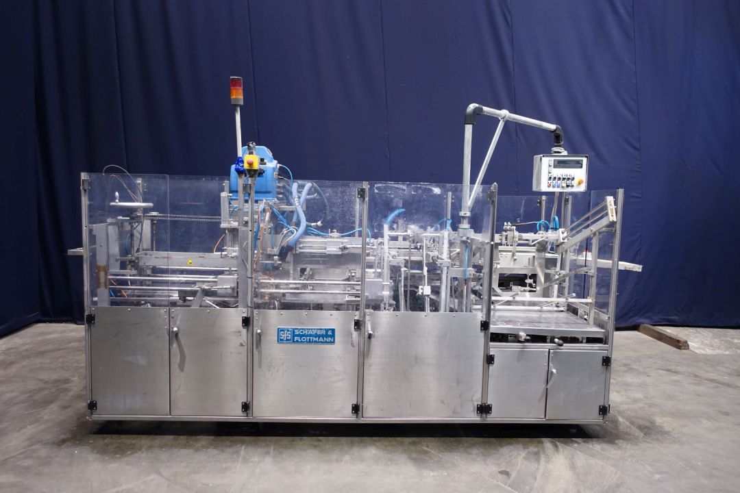 Fully automatic packer, to pack butter packs in an Carton type: American folding box. Operates fully automatically and all principal movements are mechanically driven. Used for 250gr bricks of foil 100 x 75 x 35 mm packed / and wrapped. Maximum box dimensions 330 x 220 x 230 cm. Current dimensions of the box/plano: 300 x 200 mm. Layout of the box 4x2x2 layers = 16 packs of 250 gram per carton = 4kg / carton. Capacity = max. 15 cartons per min. = max. 240 packages per min on input, 2 lanes. Nordson Problue 7 hotmelt glue unit with 3 glue points. Controls Siemens S5 PLC. Has been running together with Benhil 8362 foil packing and wrapping machine (STN15200). Total machine dimensions: 440 x 185 x 220 cm.