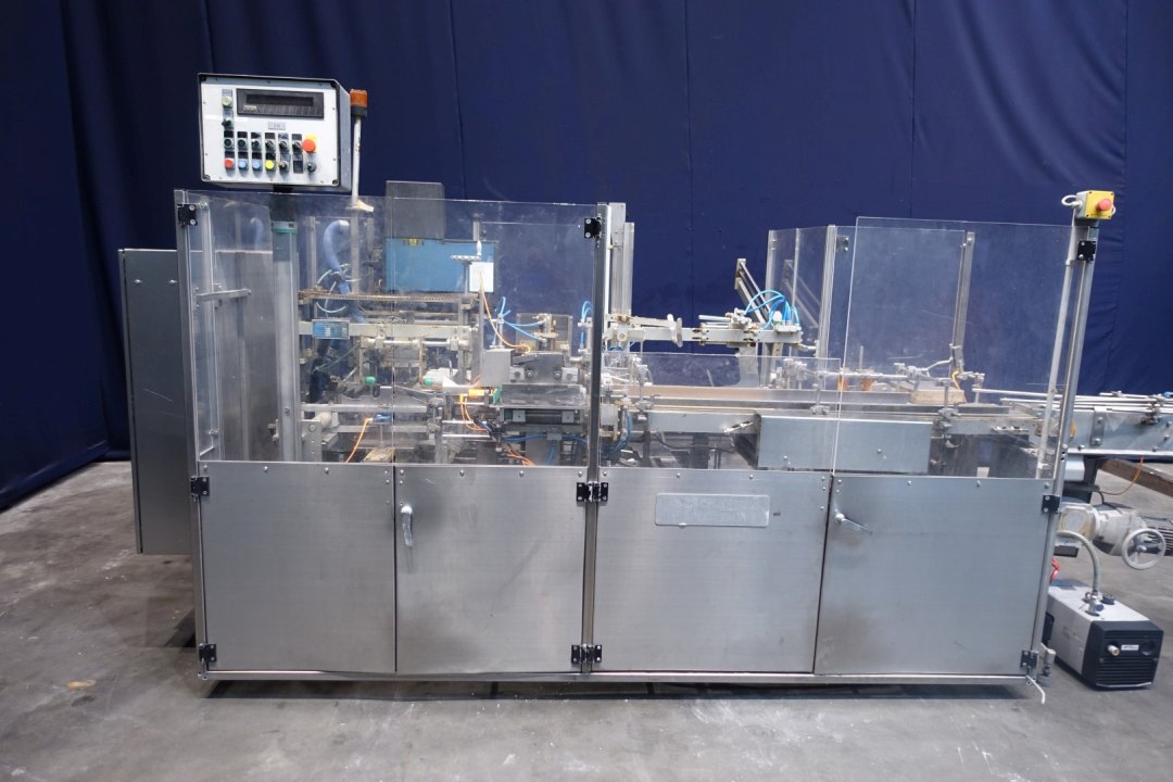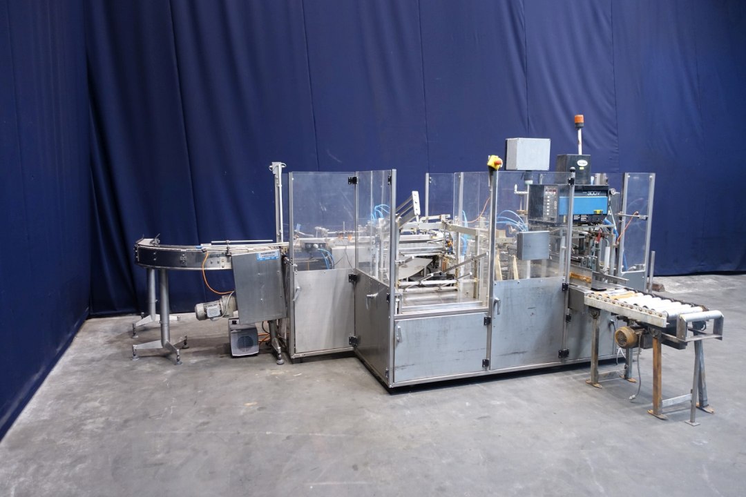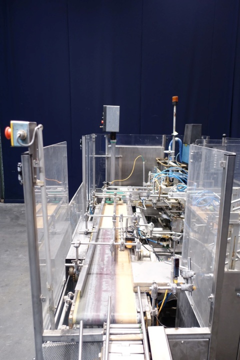 Fully automatic packer, to pack butter packs in an Carton type: American folding box. Operates fully automatically and all principal movements are mechanically driven. Used for 250gr bricks of foil 100 x 75 x 35 mm packed / and wrapped. Layout of the box 4x2x5 layers = 40 packs of 250 gram per carton = 10kg / carton. Nordson 3100V hotmelt glue unit with 3 hoses and 4 glue points. Controls Siemens Simatic S7-300 PLC. Total machine dimensions: 306 x 185 x 210 cm, weight: 2.030 kg's. Also available in complete line with SIG packer (STN15443), interconnecting conveyors and metal detector (STN15448). Electrical diagram available.