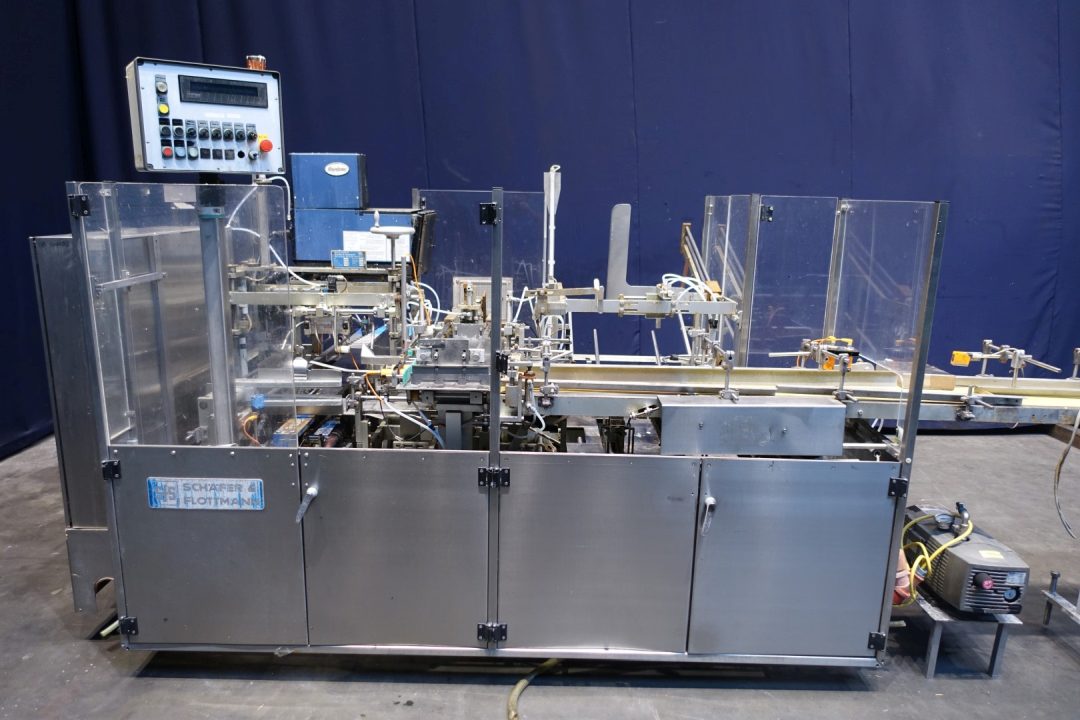 Fully automatic packer, to pack butter packs in an Carton type: American folding box. Operates fully automatically and all principal movements are mechanically driven. Used for 250gr bricks of foil 100 x 75 x 35 mm packed / and wrapped. Layout of the box 4x2x5 layers = 40 packs of 250 gram per carton = 10kg / carton. = max. 240 packages per min on input, 1 or 2 lanes. Nordson Microset Multiscan hotmelt glue unit with 3 hoses and 4 glue points. Controls Siemens Simatic S5. Total machine dimensions: 392 x 178 x 212 cm, weight: 2.090 kg's. Also available in complete line with SIG packer (STN15445), interconnecting conveyors and metal detector (STN15449). Operation manual (folder) including electric diagram available.