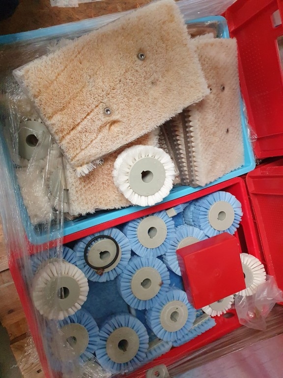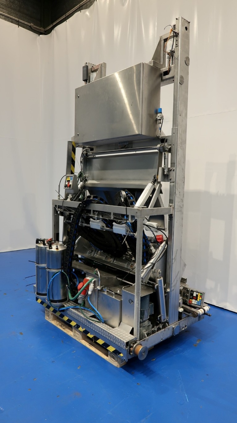 Cheese coating, turning and shelve stacking robot. To automatic handle cheeses in a maturing room. The unit takes shelve from the rack, coats the cheese (turns) and put the shelve back in the rack. Also without coating used to fill the racks with cheese. The robot moves forward through the ile of the maturing room and this safes heave labour. For round cylindric cheeses of 6kg round 30cmx 10cm height (variations possible). Both wooden and plastic boards can be processed. This robot was used for wooden cheese shelves (105 x 30.5 cm) Approximately 2200 cheese shelves are available (under STN15789). The movements are electrically and pneumatically driven, Compact design, user-friendly, consistent spreading quality, brush duration and the amount of spreading fluid can be adjusted. There is an option to choose between circulation or single spreading. Turning the cheeses has a positive effect on the aging process. During the spreading process, the board can be replaced. The operation is made possible through a simple control panel. A cheese change option is available. In- and out-feed programs are selectable. Modern PLC control for process monitoring and fault reporting. The capacity is approximately 100 boards per hour and with Siemens Simatic S7 controls. The robot worked together with a stainless steel racking system and cheese shelves (4x) 1280 x 50 x 255 cm (available under STN 15799 and STN15836). And also the complete climate control is available. (STN15810)"