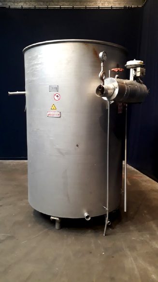 Tubular pasteuriser for emulsion for margarine production. Vertical. Spiral. Maximum working pressure: 75 bar. To be placed after the High Pressure Pump for minimum re-contamination. 2 Sections. 1 Section heated by steam in steam chamber (max 13 bar pressure). Cooling by cooling water (inner tube and spray pipe). Thermal cycle approx: 45 - 85 - 45 °C. Total dimensions: 2,4 x 1,9 x 2,7 mtr.