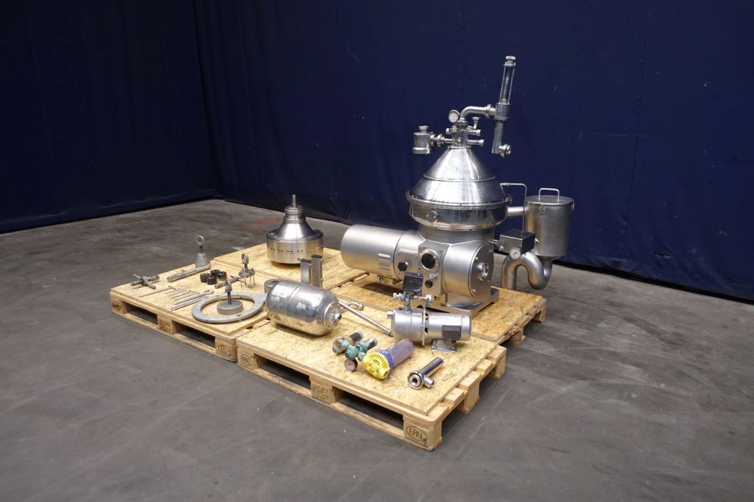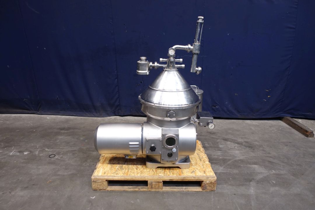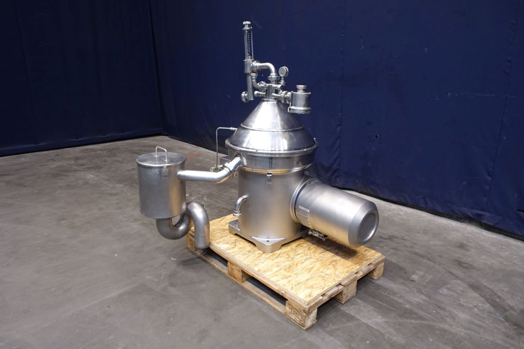 Milk or whey skimmer, self cleaning. Including bowl, motor cover, pneumatic counter pressure valve milk , manual flow regulation valves for cream out and remix cream to standardise the milk inline direct connected to the separator, manouvering water valves. Motor 7,5 kW - 15,4 A - 1.450 rpm. Set of tools. With Ebara centrifugal water pump and water filter. capacity with whey up to 7,000ltr/h Excluding: base frame, controls. User and maintenance manual available