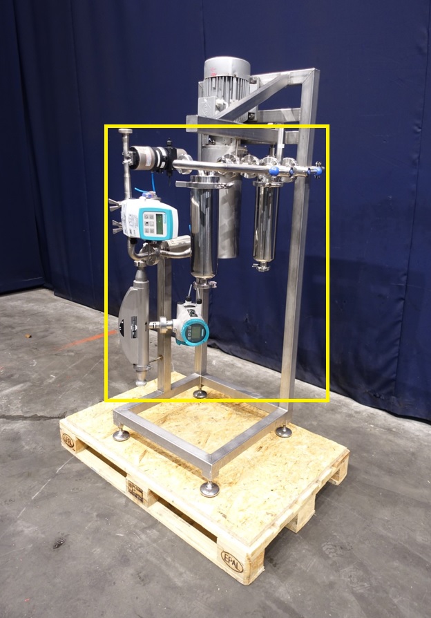 Mix system to inline 2 liquid ingredients with and without conductivy like a fatt and water including: Siemens Sitrans FC330 mass flow transmitter. Capacity minimal 240 kg/h to maximum 20.500 kg/h. Connections: in 26 mm / out 26 mm, DIN. With electronic head-display. With Siemens Sitrans F M Mag 5000 magnetic flow transmitter with tryclamp connections and 2 x SS amazon filters, type 720117VH10M1PS01, volume per filter 2,60 ltr. With spare filters 20 and 30 micron. Filter system with 4 x manual butterfly valves. Built on SS frame with indag inline mixer, which is STN15268. Dimensions: 120x80x185 cm. Total weigth 185 kg.