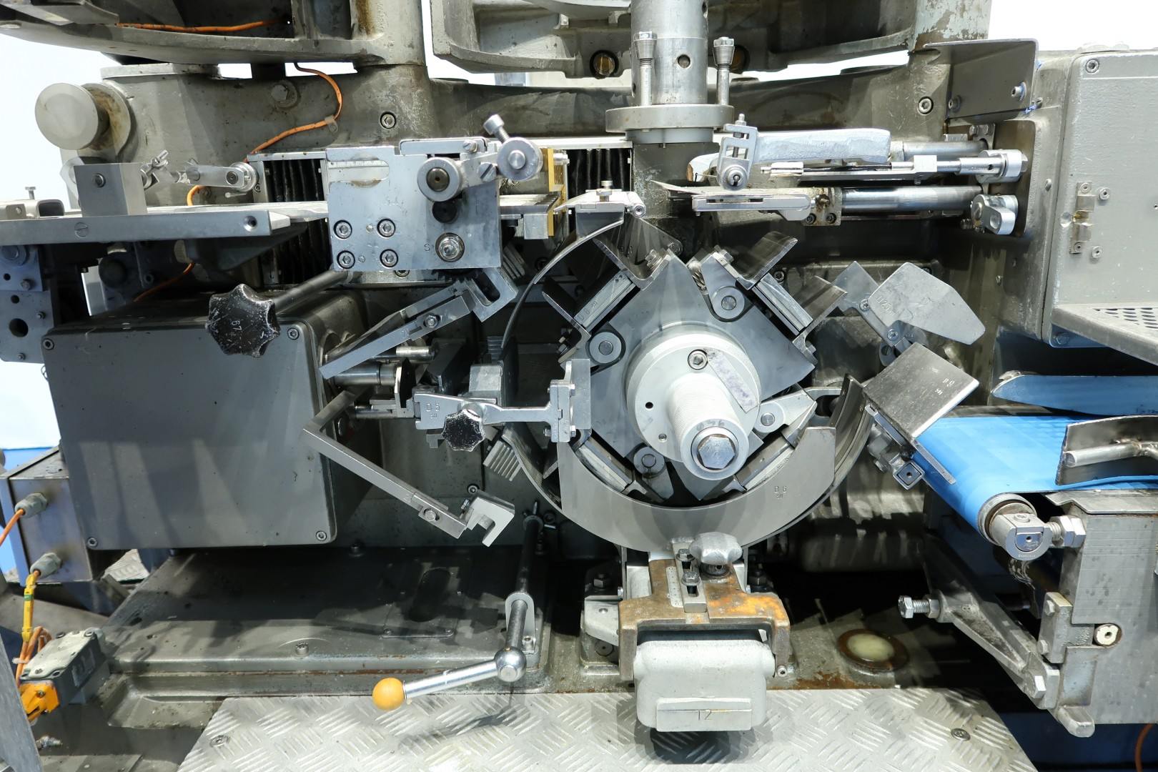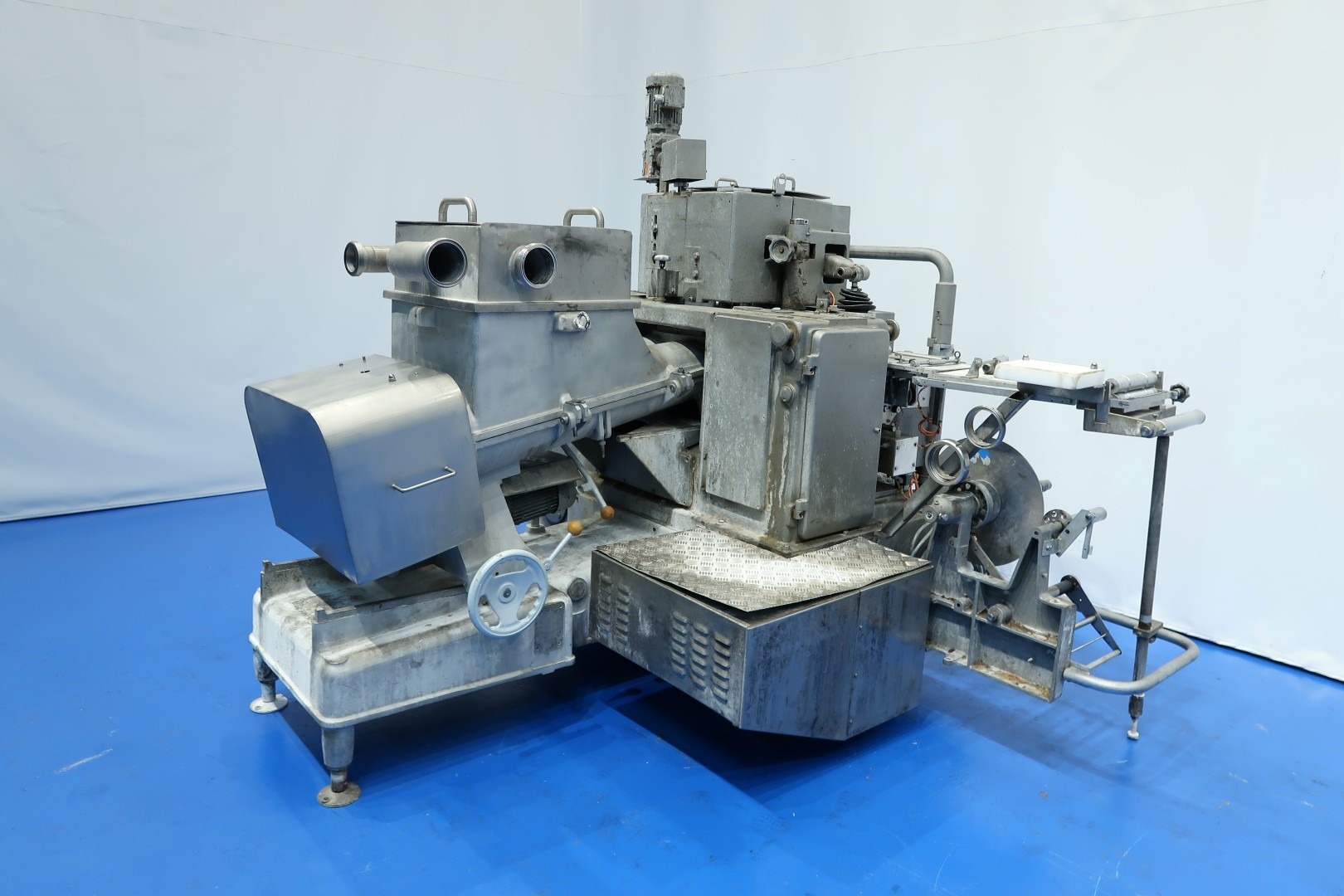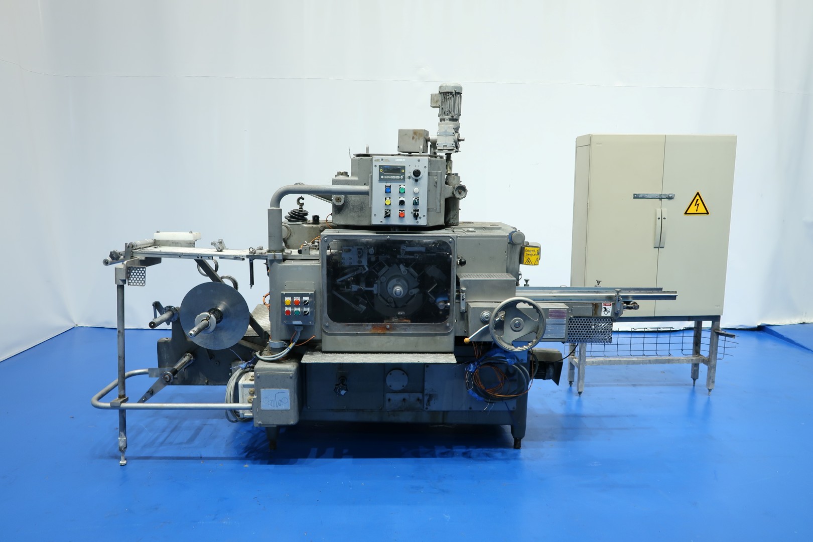 Full Automatic filling and wrapping machine for butter in aluminum foil or parchment paper. Product feed by trough and augers. Outfeed conveyor of 110 cm. 1x French format sets on this machine: 108x63x39 mm = 250 gram. mechanincally prepared for hotmelt. Control panel with PLC control (Modicon TSC Micro). Total dimensions: 314x226x200 (lxwxh) cm - weight ca.: 2.750 kg.