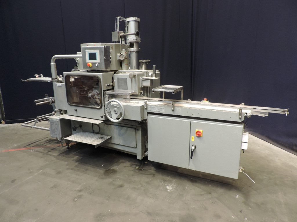 Full automatic filling and wrapping machine for margarine in aluminum foil or parchment paper. Product feed by direct link up with compensator (CIP), butterfly valve, bend and pressure relief valve. Photo cell for print centering device. Outfeed conveyor. Format set 500 gram, rectangular, 140 x 80 x 50 mm. Control panel with PLC control (Siemens S7) and Siemens OP. Instruction manual available. Reconditioned in 2010 by Lekkerkerker Dairy & Food Equipment. Has been running together with Norreg packer (STN12961) Outside dimensions: 4 x 2,1 x 2,3 mtr. Weigth: 2750 kg.