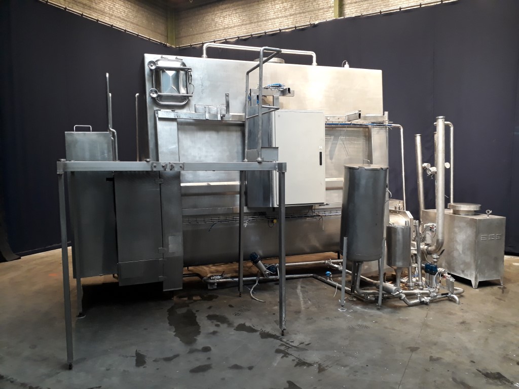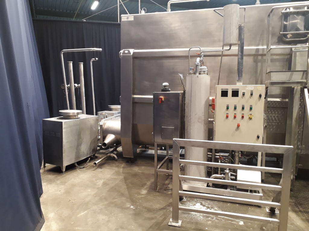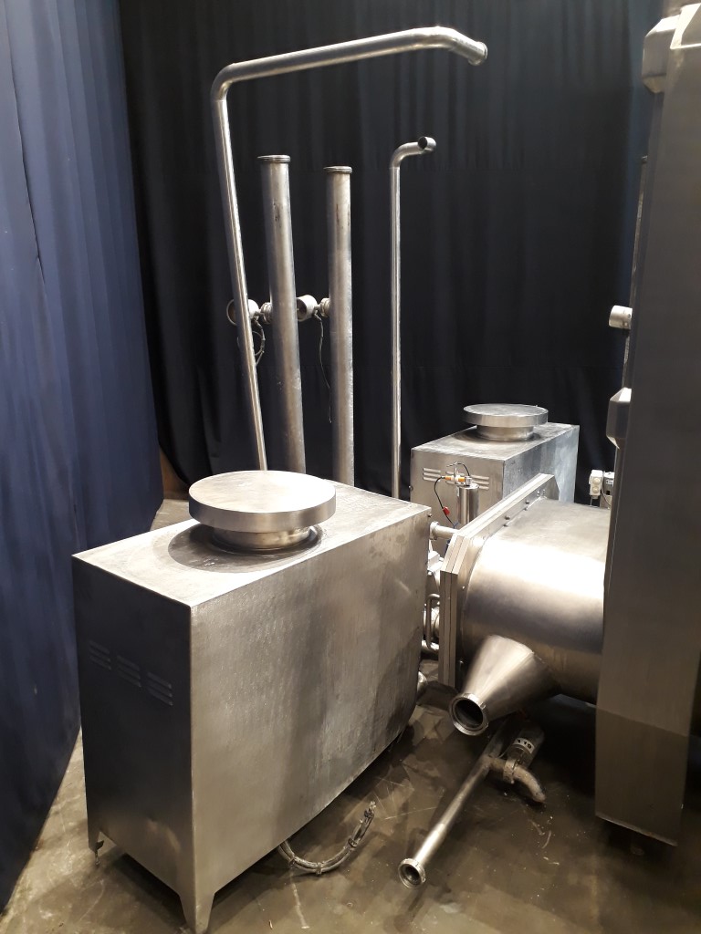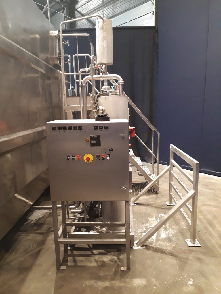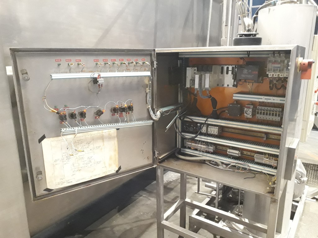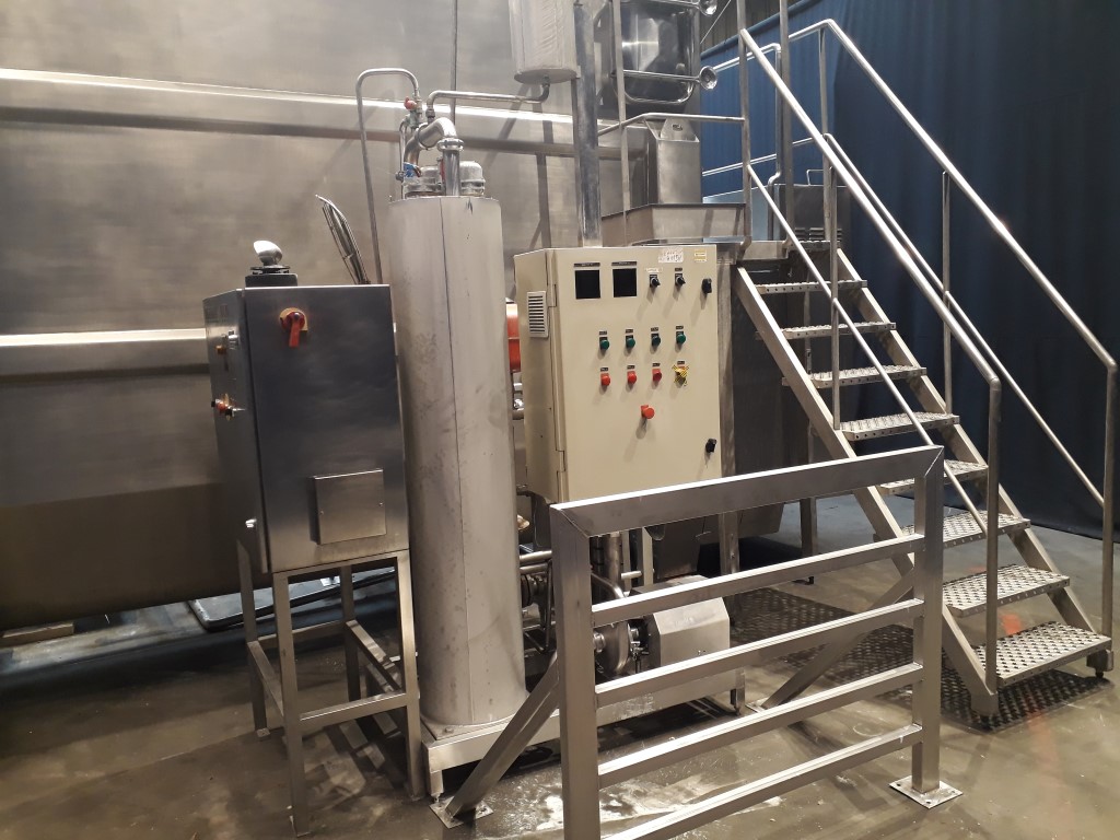 Butter silo with 2 augers, CIP cleanable, manhole, flange with 4 connections but with 3 outfeed lobe pumps (simon freres) and cip return pump. control panel. Total dimensions: 600 x 250 x 330 cm.