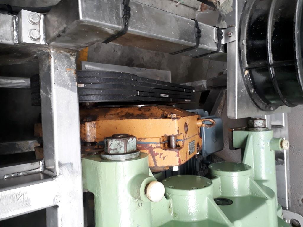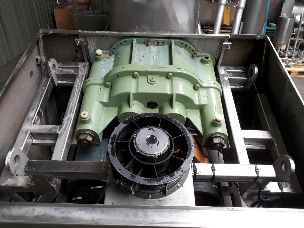 Butter mixing and kneading machine with 2 sections. Section 1: for vacuum, section 2: for injection of culture or water. Feeding of the machine by a butter reworker. This machine has the possibility of precisely adjusting the moisture content by injection culture or brine water, or blending 2 different butters from 2 different reworkers. Vacuum working to reduce the air content. Useable for working / softening and blending any product with a consistency similar to that of butter. Complete with all piping, framework and round, open return vat.