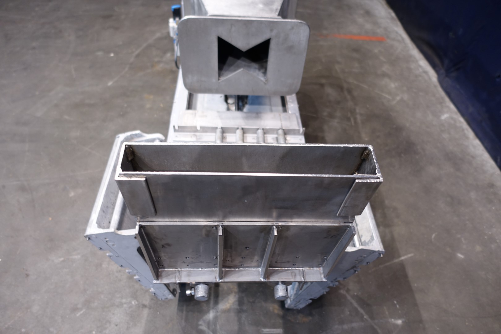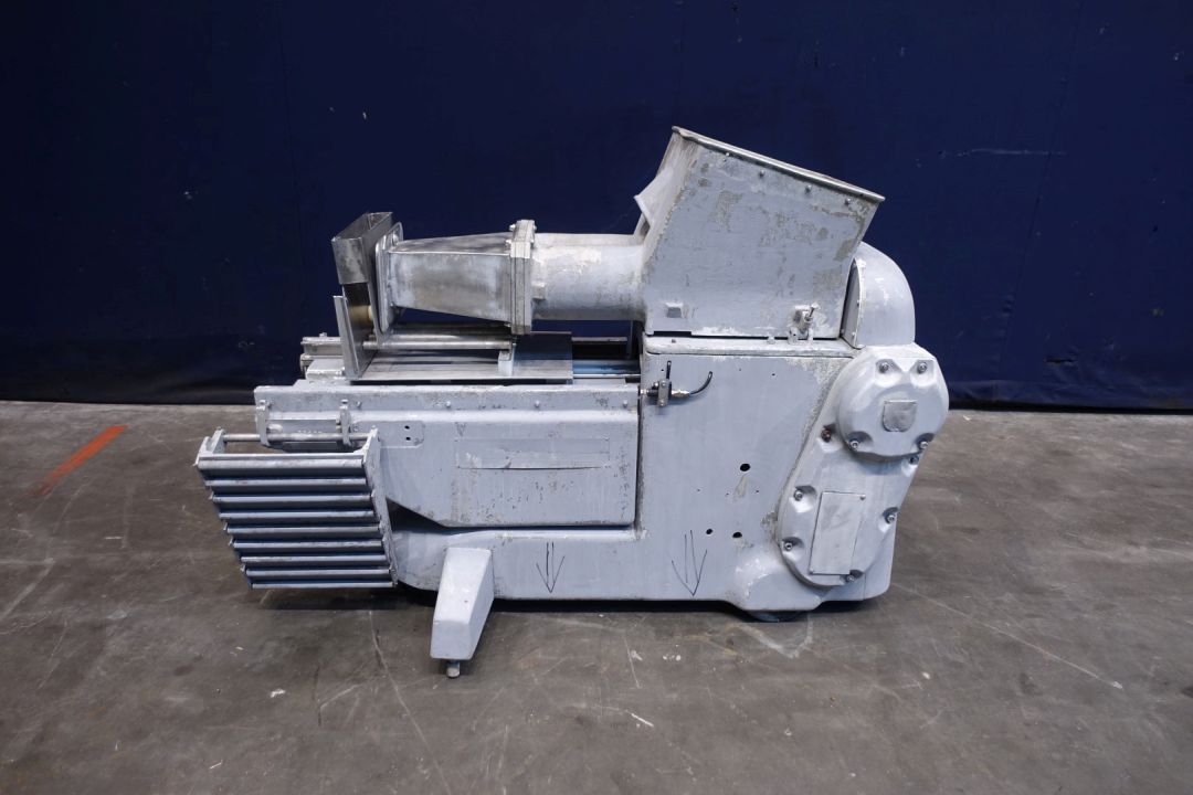 Semi automatic bulk packer. Packaging of butter in blocks of 5 to 25 kg. Cardboard box filling. Manual weight adjustment. Direct infeed via hopper. With roller wheels to side, side rolling table. Total dimensions: 180 x 95 x 124 cm.