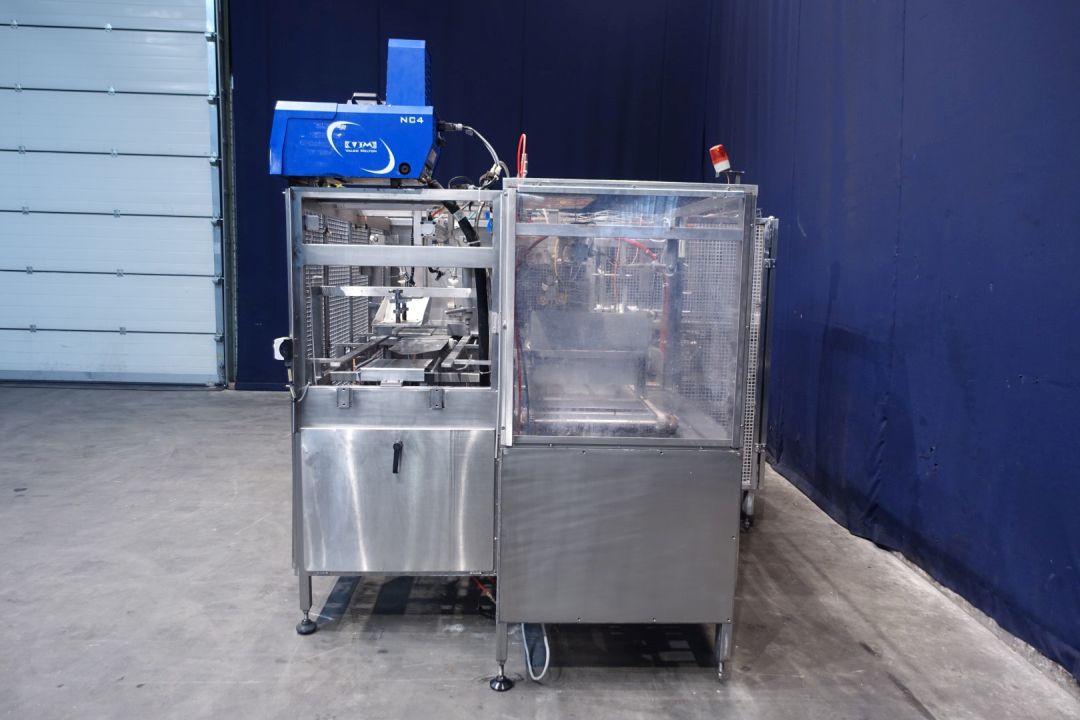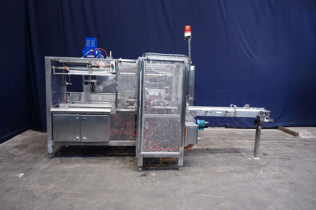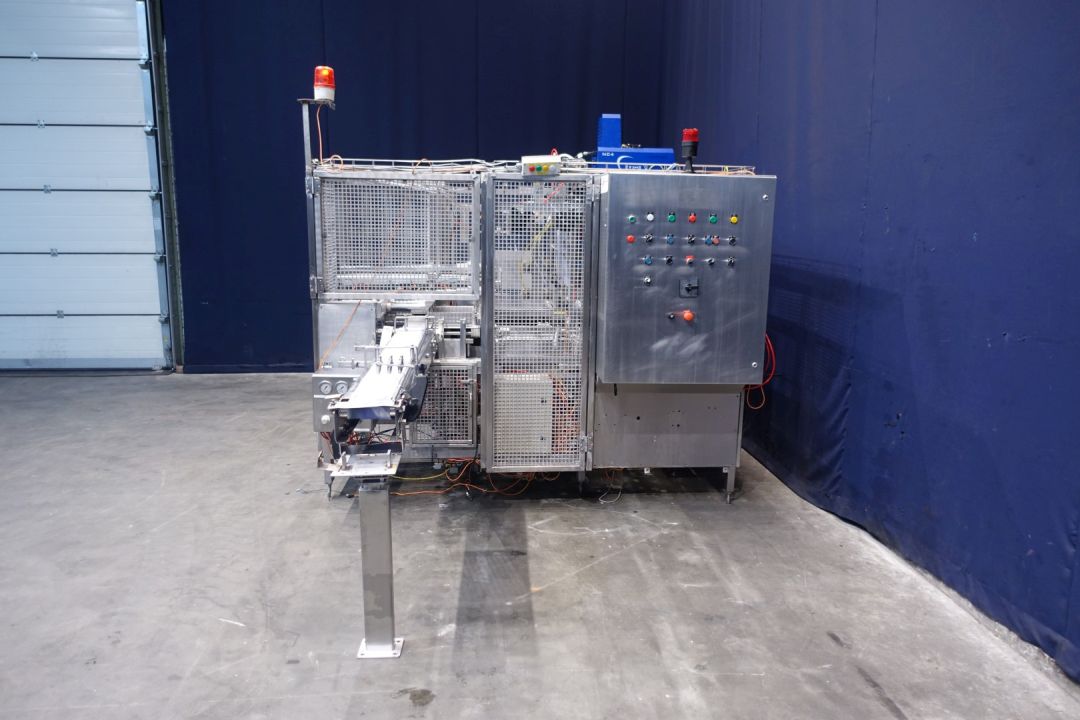 Fully automatic packer, for American folding boxes. Used for 200gr bricks of foil 90 x 53 x 44 mm packed and wrapped. Current dimensions of the box: 375 x 290 x 135 mm. 5 x 4 packs x 3 layers = 60 packs. Including hotmelt Valco Melton model: NC4 (1 tube). Modicon controls. Has been running together with SIG FD140 foil packing and wrapping machine for margarine (STN15313). Machine dimensions: 290 x 230 x 235 cm. Weigth ca. 1.200 kg's.