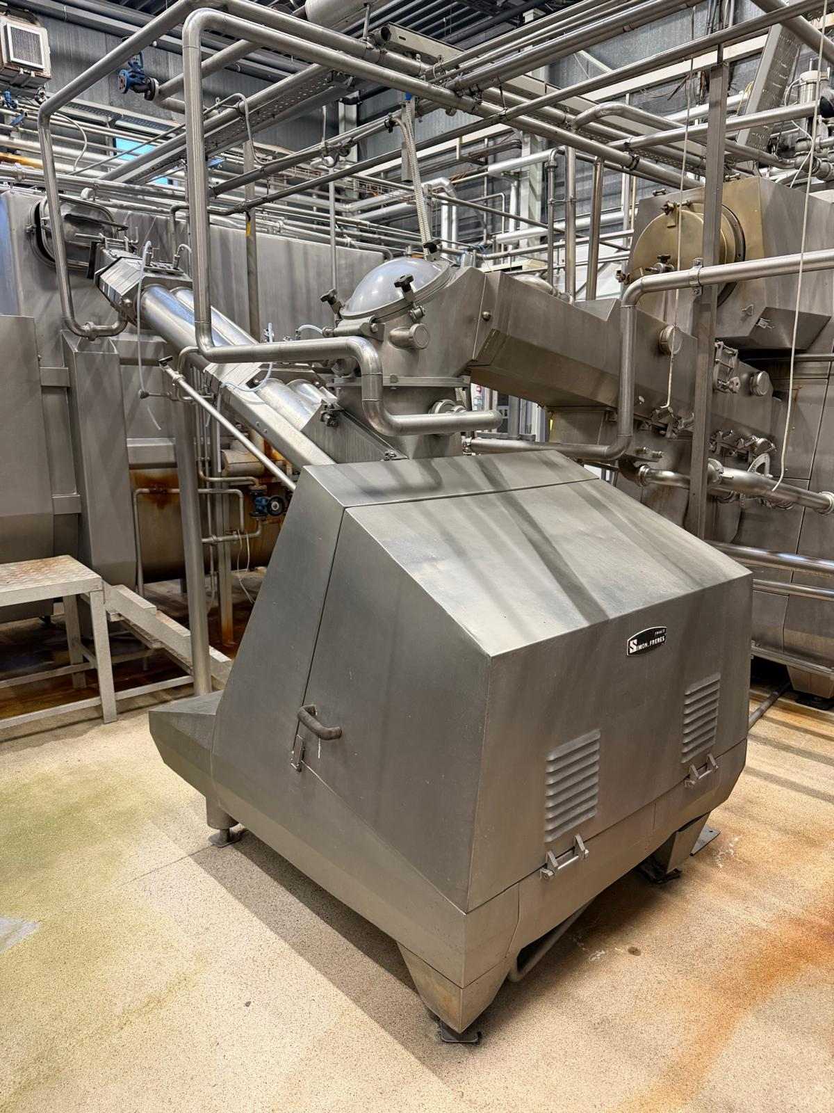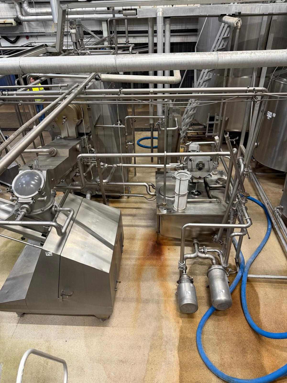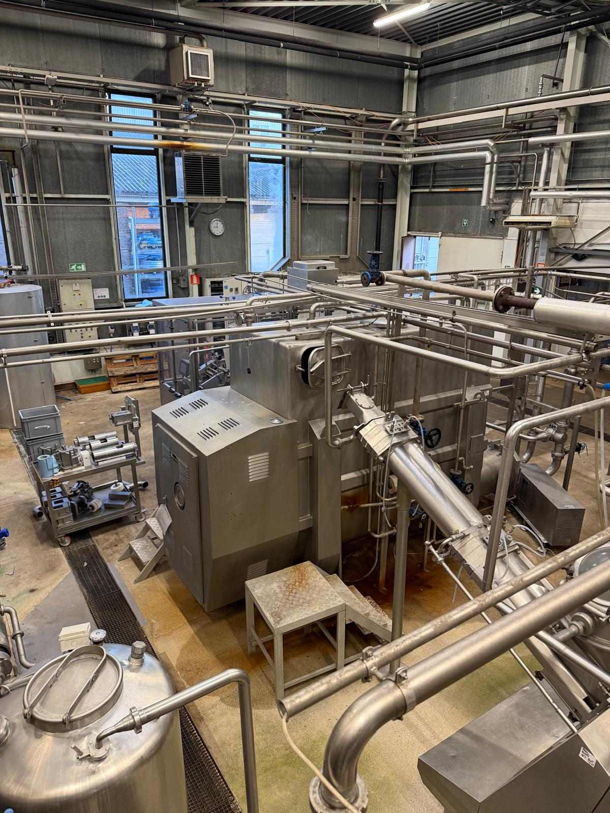 Complete continous butter production line (CBM). Operating principle of the production line: the cream pump transports the cream from the buffer tanks to the CBM. The CBM is capable of converting 4.000 liters of cream into 2.000 kg of butter. It also features a butter milk cooling and a vacuum section, and injection pumps for culture and water or brine. Furthermore, it includes all needed buttermilk components: CIP pumps, a collection tank, valves, piping, and all the necessary controls. After the butter is made in the CBM, it is pumped into the Simon freres butter silo, which includes 2 Waukesha outlet pumps to transport the butter to the filling machines. Documentation available.