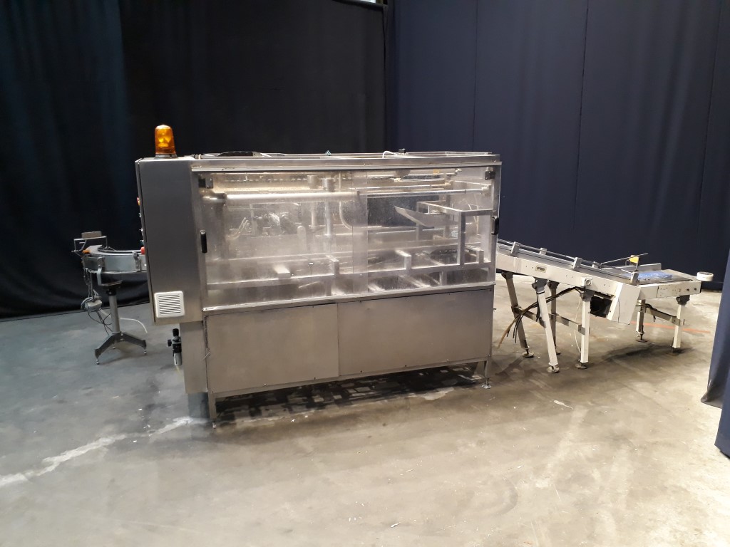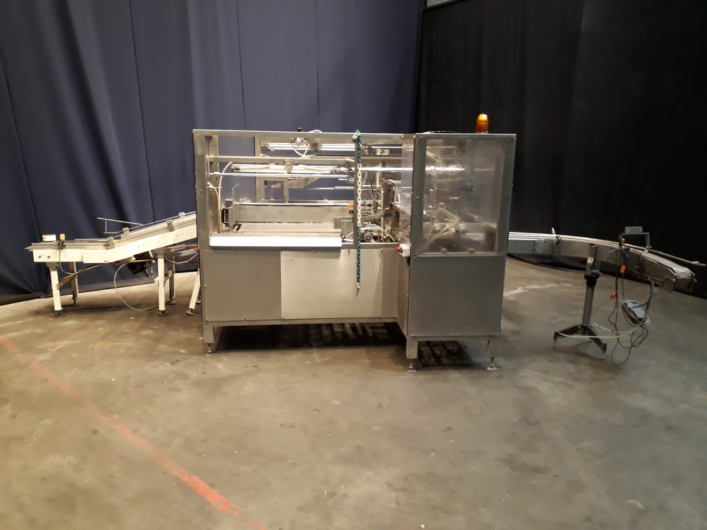 Fully automatic case packer for butter packages in a carton box. Currently set for 250 gram packages of 108 x 63 x 39 mm, pack scheme 5x2x4 = 40 packages of 250 gram in 1 box (10 kg per box). Type of cartons: American folding box. Including infeed and outfeed conveyor.