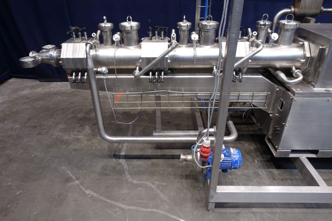 Inline continuous butter mixing machine. With 2 augers (diameter ± 110mm), double jacketed, length augers: 1.6mtr, 3 sections of 52cm each with infeed SMS 4", 3", air injection points, liquid injection points in every section. CIP cleanable, vacuumsystem can be added. Currently equiped with heating on the jacket (normal is cooling). Max air pressure 6 Bar. Motor 22 kW (variable speed 50-180rpm)- 40,7 A - 400 V - 50 Hz - 1468 rpm. With 1 x centrifugal pump - 2 x 2" Din. Total dimensions: 340 x 140 x 215 cm. Weigth 1.350 kg's. Control panel with freq converter 22kw, with plc and hmi screen (no software).