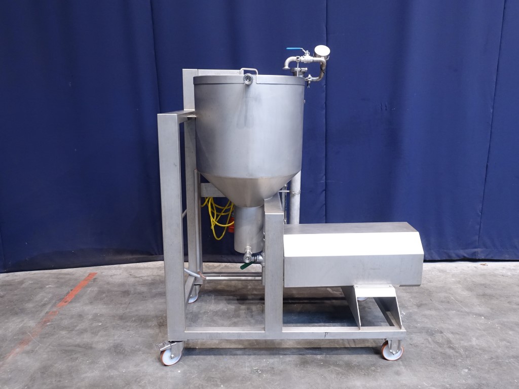 Pilot filtration unit up to 50bar. 1 Filter section Filter housing : typ: 2540 pressure vessel for Filter elementes MF-UF or RO dia 25"/ 40", 62mm - 1.016mm Dimensions. Double jacketed balance tank with cover (Geurtsen, type 51416, serial nr 2071642, 2007, volume 150 ltr), feedpump (Hydra-Cell pump, G10XKSESFEMD-M2M, 316L stainless steel head, EPDM diaphragm & O-ring material, 316L stainless steel valve seat material, stainless steel valve material, Elgiloy valve springs, PVDF valve spring retainers, serial nr 206822, motor 4 kW - 1.440 rpm, max pressure 50 bar, 120-1.470 ltr/h), 1 recirculation loops through filter and balance tank, 1 Flow indicator. Control panel with start/stop and potential meter to control the pump. 1 Frequentz converter. Mobile mounted on a stainless steel frame. Total dimensions: 120 x 160 x 190 cm.