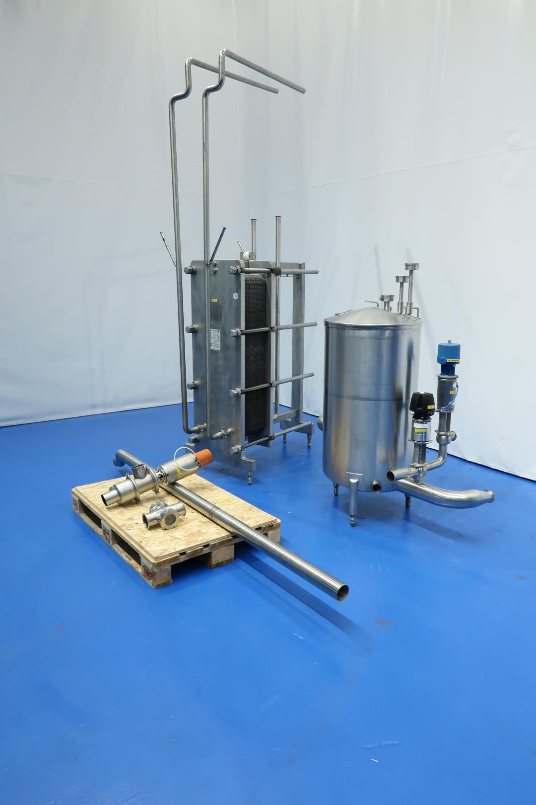 Plate heat exchanger, (PHE). Max working pressure: 10 bar - max working temperature: 110 °C. Beam length: 100 cm, connections: 4 x 2" Tryclamp. Current configuration: 1 Section; 77 plates. Connections head: 2 down, follower 2 down. With balance vessel (ca. 250 ltr.) with level sensors, valves and piping. Originally used as cream cooler ± 55 -> 4°C at 3,000ltr/h but can also be used for other liquid products with different flow/temperatures capacity 149kW. Dimensions PHE: 117x70x168 (lxwxh) cm - weight: 742 kg.