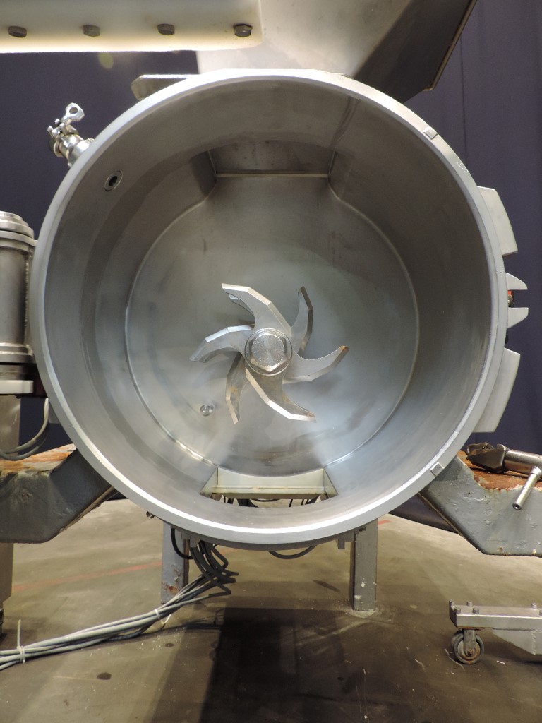Universal horizontal mixer-cooker. The main product bowl and cover are double jacketed for cooling or heating (no valves on jacket), no vacuum. Hydraulic unit for moving inlet slide and outlet slide on bottom. Top inlet and the main front lid have 2 manual tightening clamps and contact sensor, infeed hopper. 2 agitators: 1 scraper agitator, 25 rpm and 1 mixer knife, motor 22 kW - 710 rpm. Total electrics: 27 kW - 60 A - 380 V -50 Hz. steel frame. Including elevator for trolleys 200ltr with controls cabinets on elevator and machine. Documentation available. Outside dimensions: 2,5 x 4,25 x 3,25 meter. Total weight: 1960 kg.