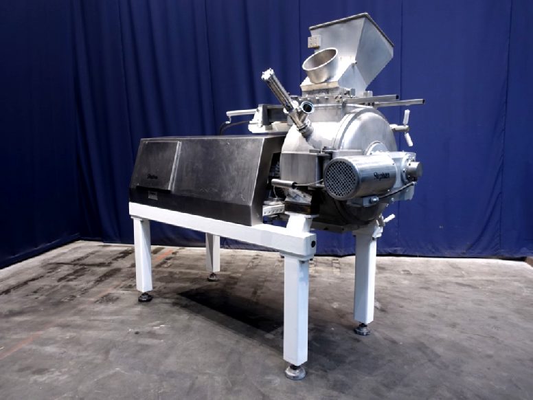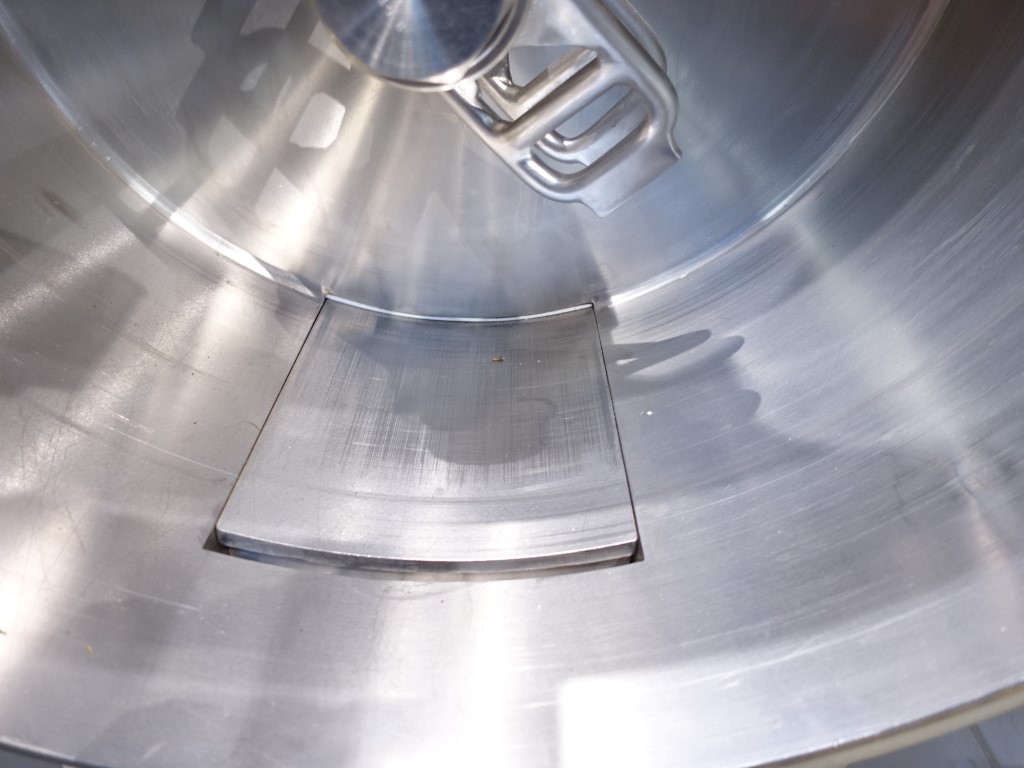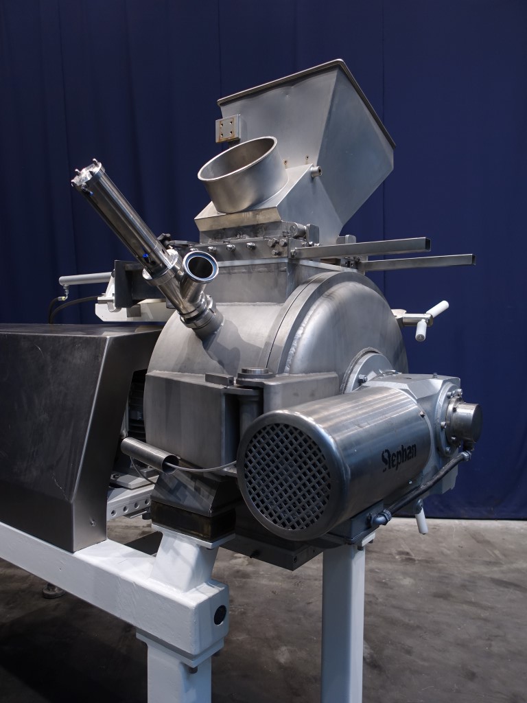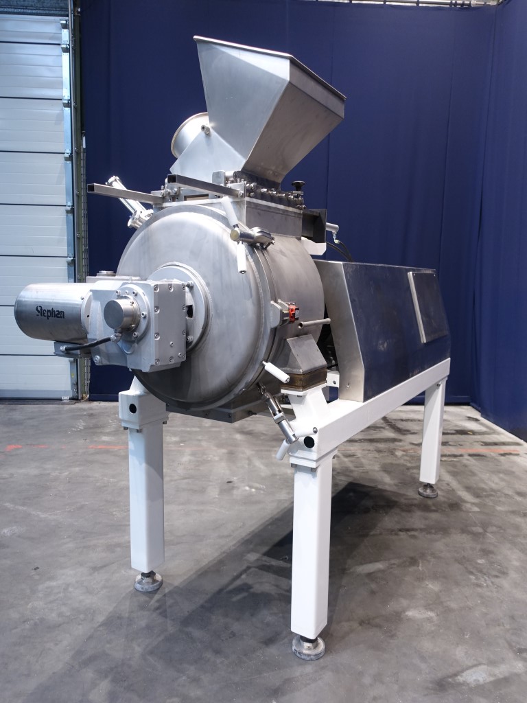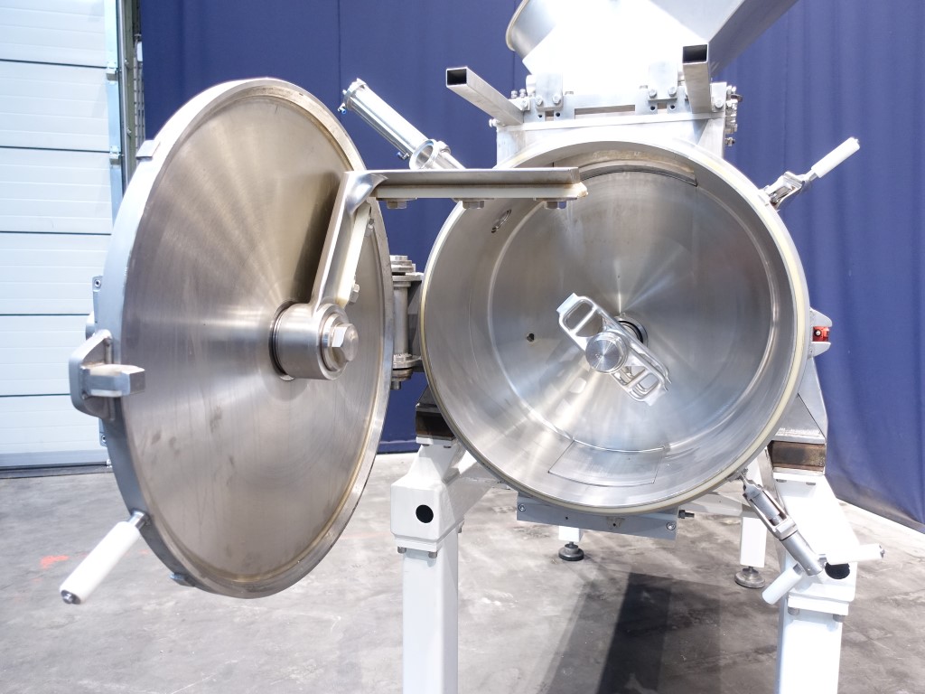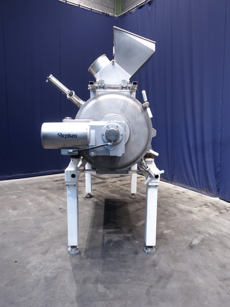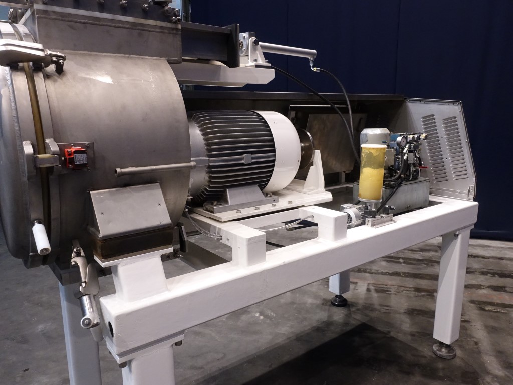 Universal horizontal mixer. The main product bowl and cover are single jackted. Currently no vacuum. Connection for temperature sensor in the bowl. Top and bottom slide for product in/outfeed by a trolley. Hydraulic unit (1,5 kW) for slide opening top and bottom. Grease pump. The main lid has 2 clamps manual tightening and contact sensor. Hopper on the top inlet. Extra product inlet 3'' on the side. 2 Agitators: 1 scraper agitator (4 kW, 25 rpm) and 1 mixer (22 kW - 43 A, 1.000 rpm, no nametag on motor). Painted frame. Excluding: Controls or break claw on main motor. Total dimensions: 1,5 x 3 x 2,6 mtr.