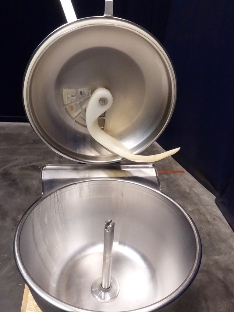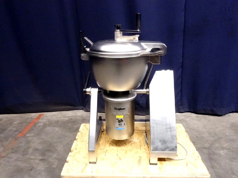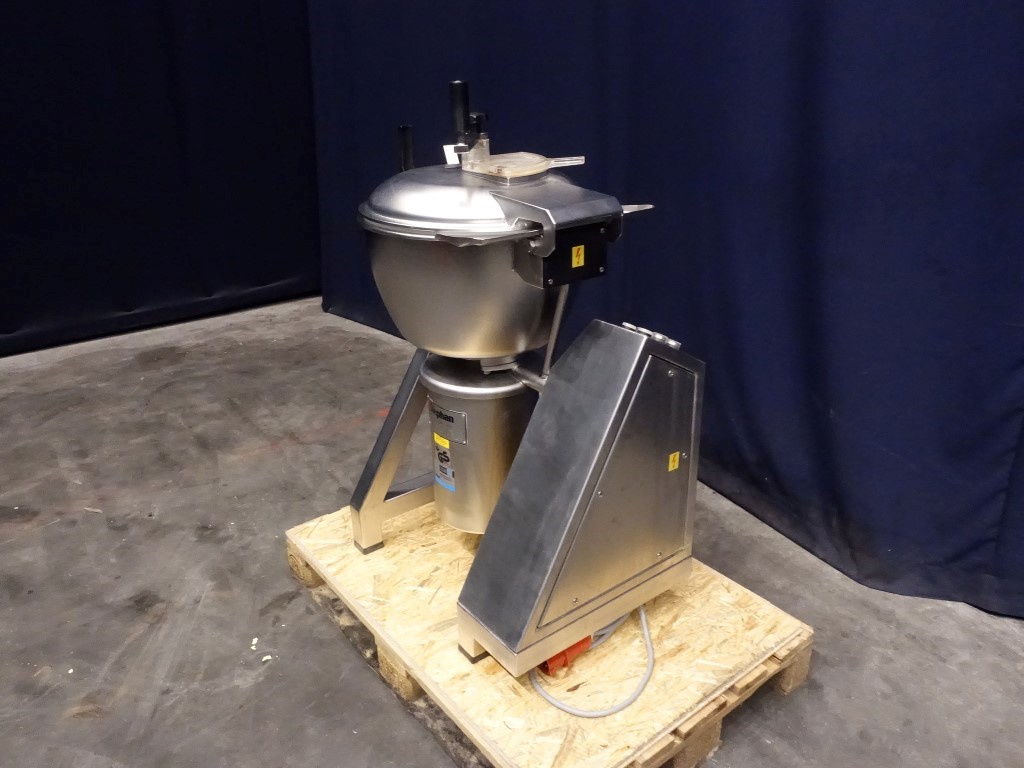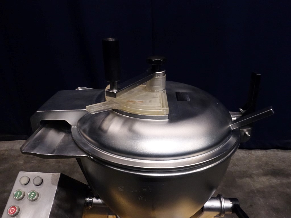 Universal vertical mixer and cutter. The main product bowl, cover and frame are stainless steel. Bowl is single jacketed. No vacuum. The main lid has 1 clamp, manual tightening and a small inspection hatch. 2 Agitators: 1 scraper agitator (manual driven) and 1 mixer knife. Main motor: 4 / 5,5 kW, 1500 / 3000 rpm. Including controls.