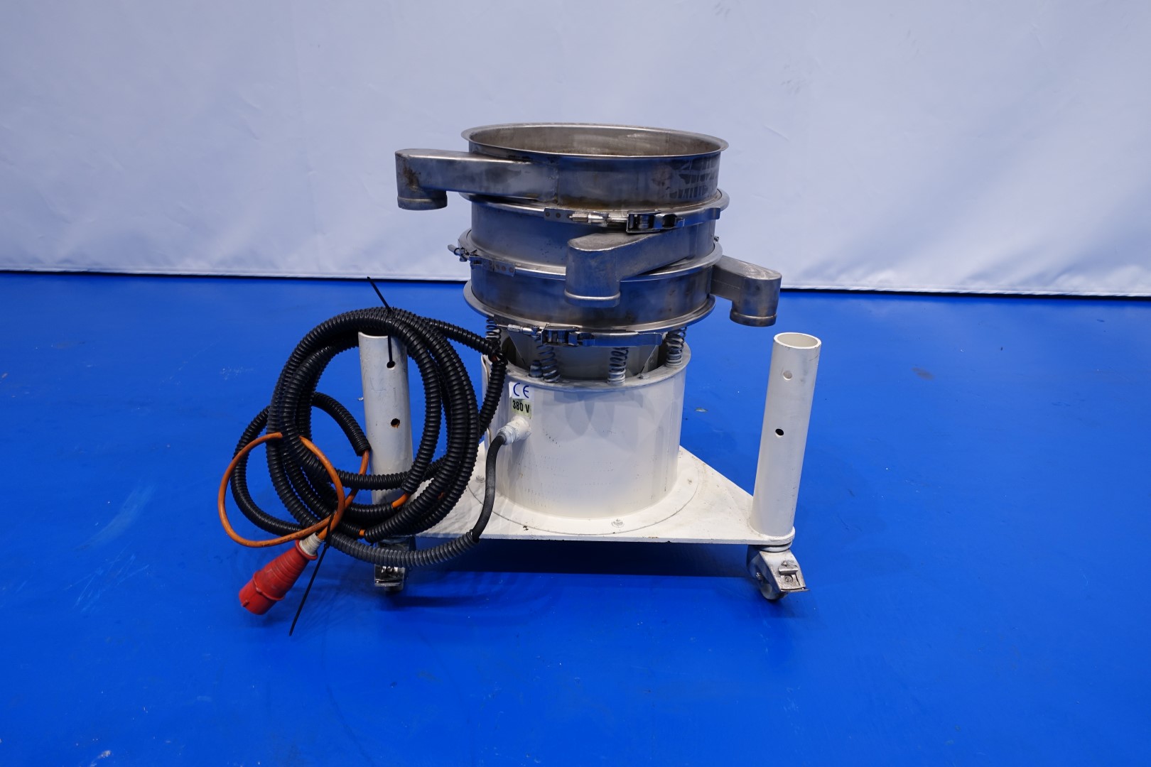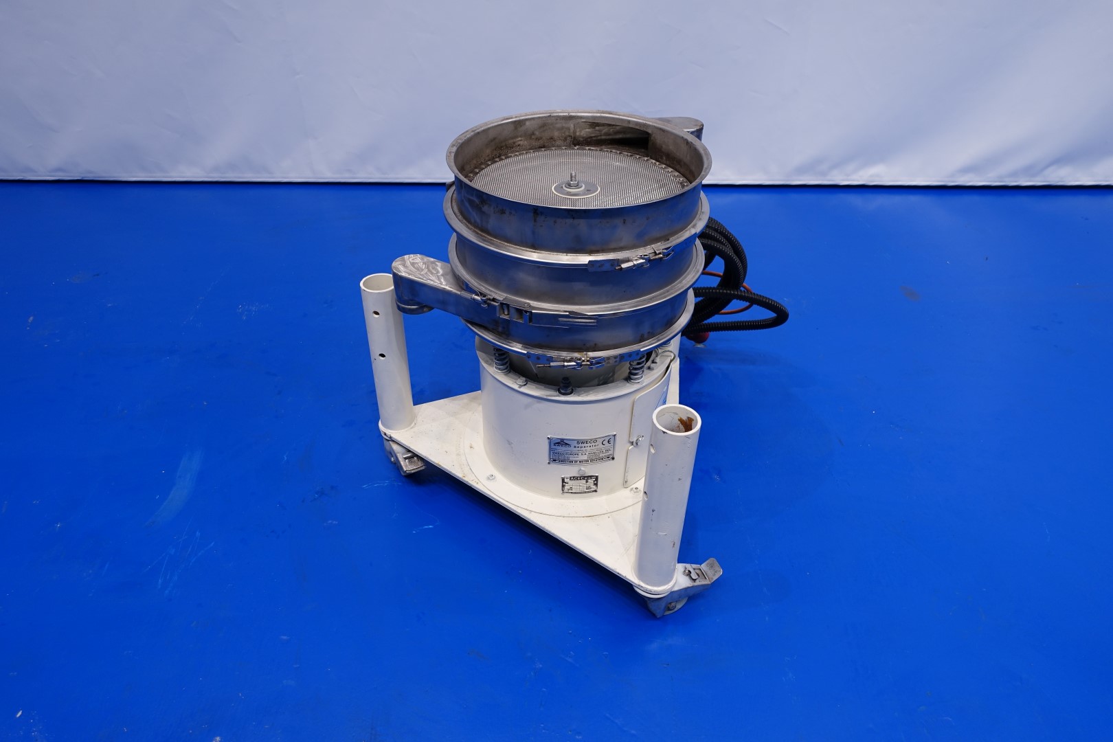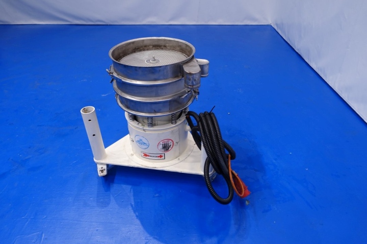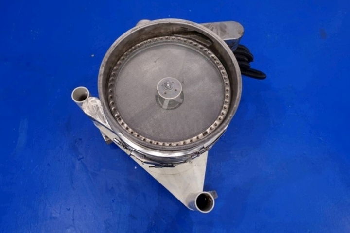 Whey sieve 18" Vibro-energy separator. Screen diameter 40 cm. Power: 380 V - 3 Ph - 0,25 Hp - 1.465 rpm. Motor: 0,185 kW - 0,66 A - 50 Hz. Total dimensions: 75x70x75 (lxwxh) cm - weight: 104 kg. Cover is missing. Documentation: parts list and general folder available.