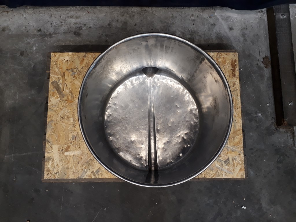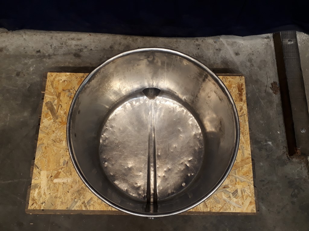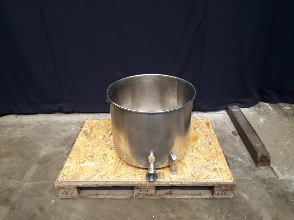 Open tank with open top. Outlet flat to the side. Product Outlet: 4'', RJT and 2'', DIN. Outlet height: 4 cm. Connector for PT-100 sensor. 4 Feet. Inside dimensions of tank: diameter 57 cm and height 45 cm. Total dimensions: 65 x 75 x 50 mm.
