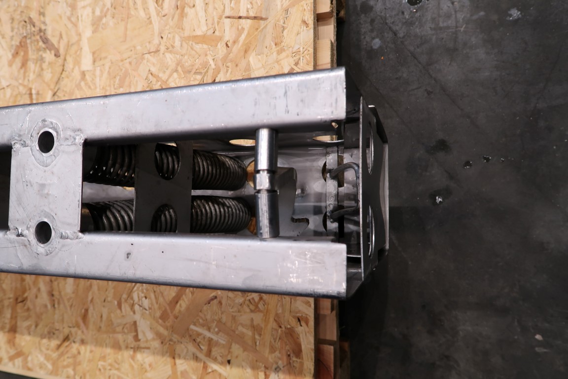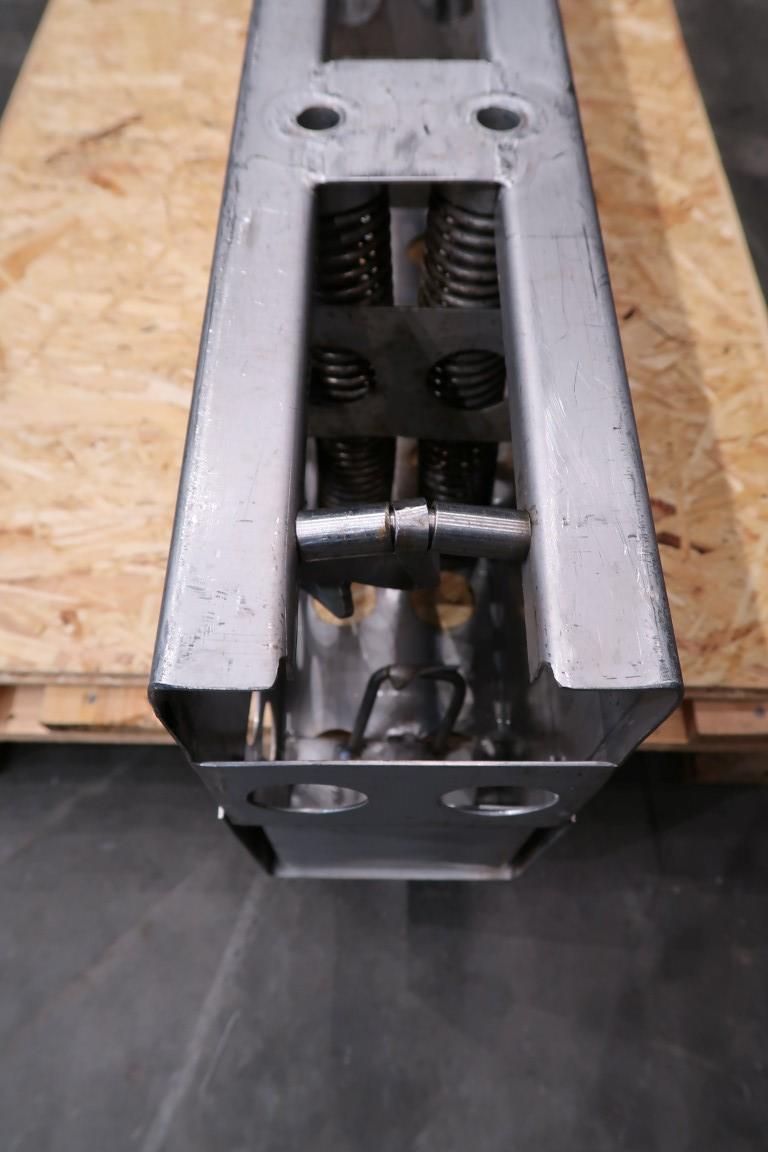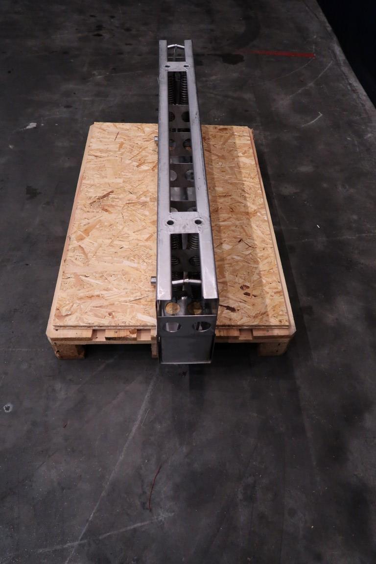 Compressable End press plate of a Pre-press/draining vessel. Diameter of the holes: 32 mm. Distance between the holes: 85 cm. Total dimensions: 139,7 x 15,7 x 33,7 cm. To be placed at the of the curd bed to be able to make the pressing bed longer or shorter.