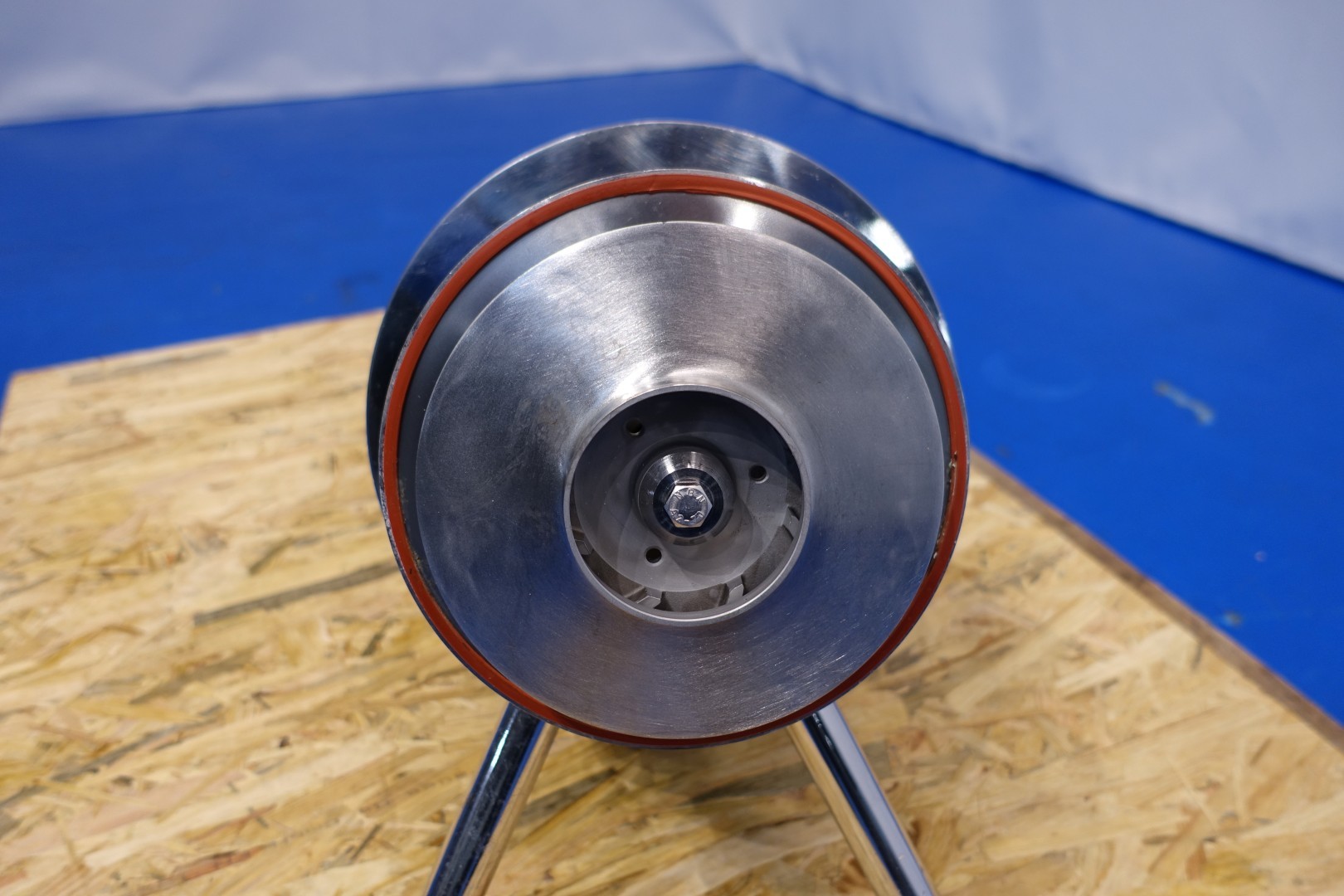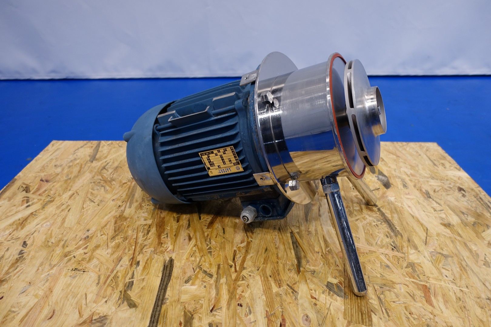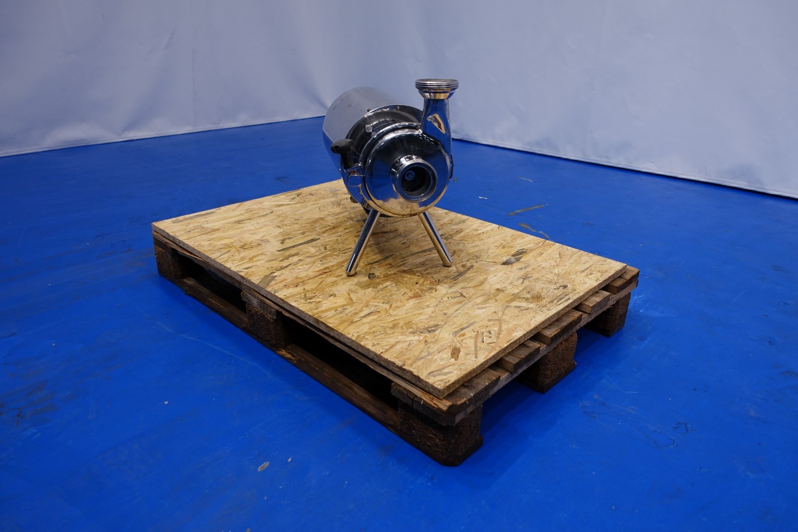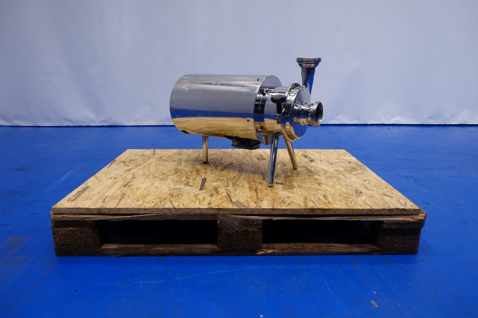 Sanitary centrifugal pump. Current motor: 5,5 kW - 8,5 A - 2.885 rpm - 50 Hz. Impellor diameter: 170 mm. Connections: (In) 3" Din '' / (Out) 3" Din. Total dimensions: 64x28x46 (lxwxh) cm - weight: 75 kg.