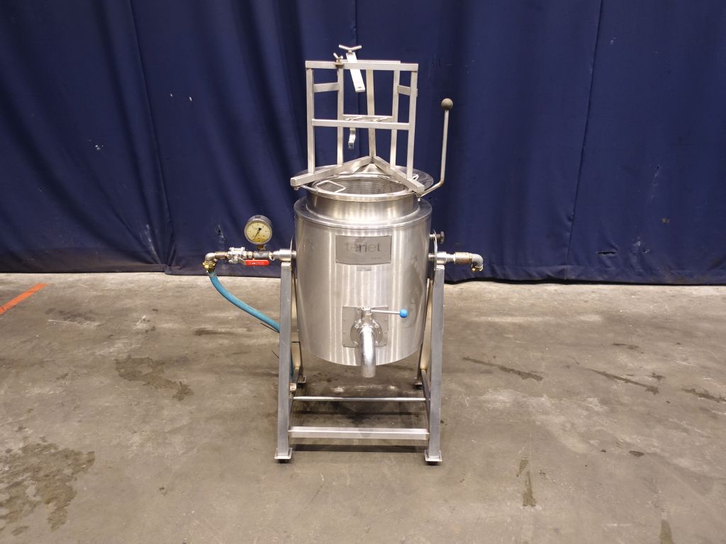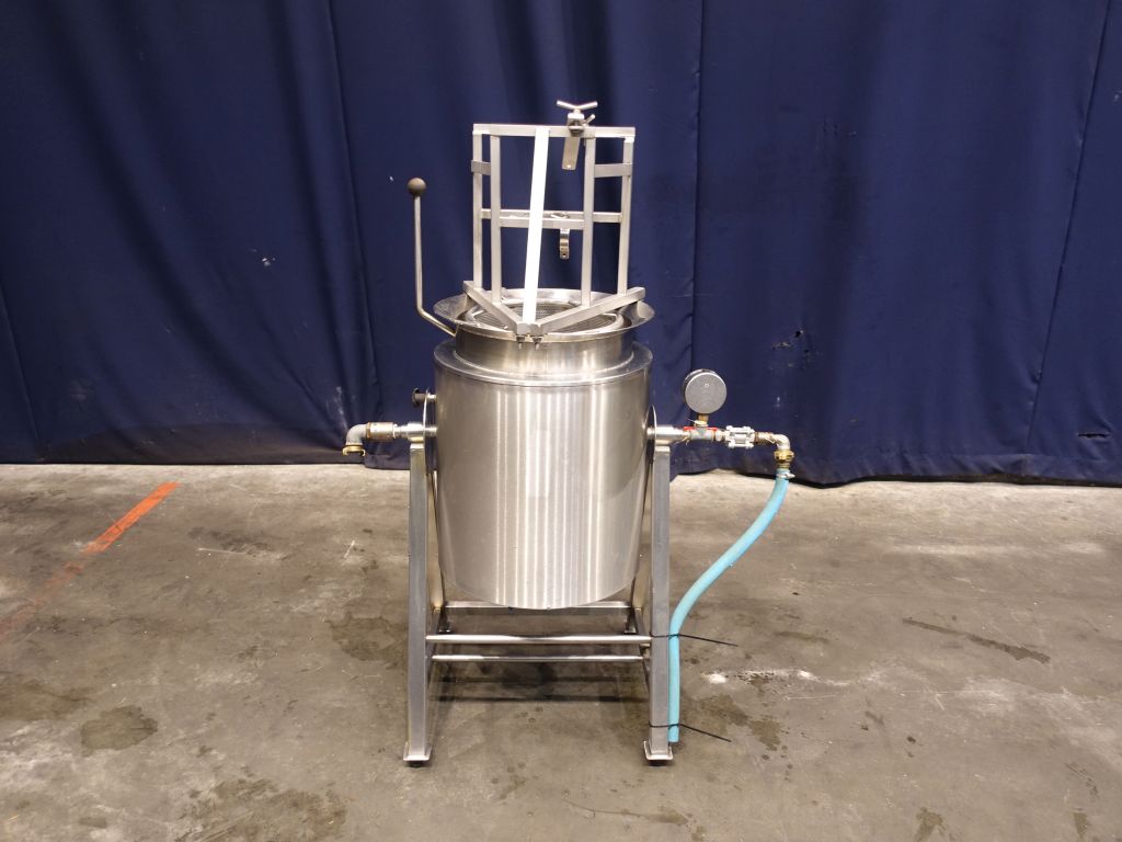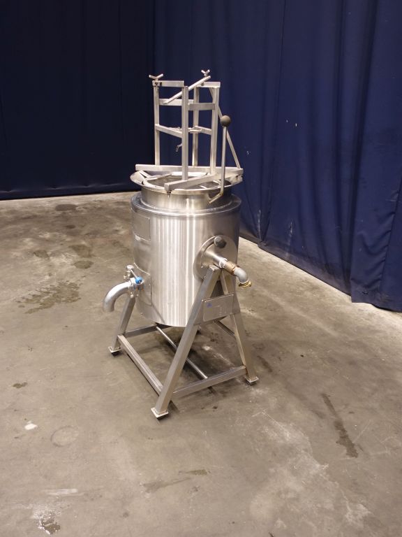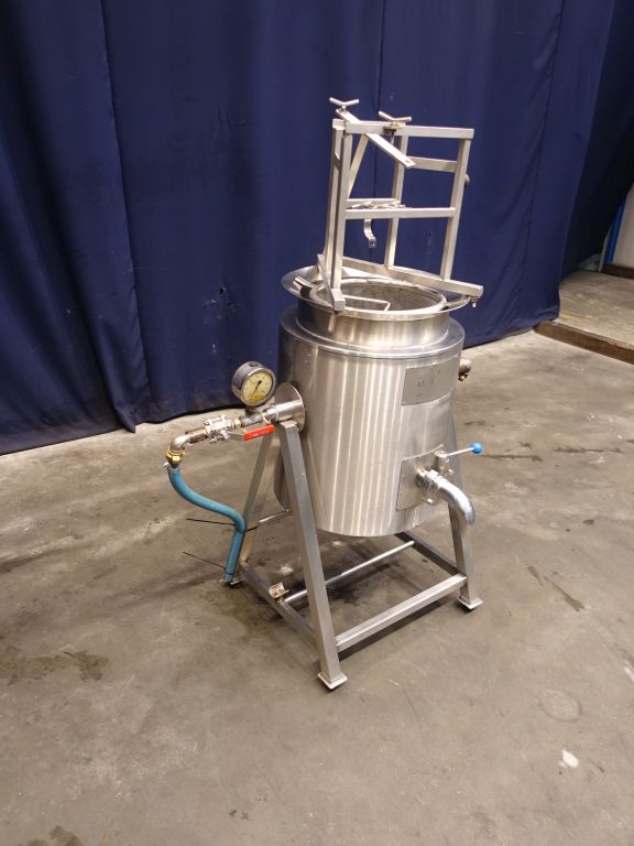 Double jacketed. Pressure in jacket 4 bar, max 150 ℃, 6 liter. Tank temperature max 100 ℃. Open Top. Flat to the side. Product outlet 2'' with manual butterfly valve. Tank is turnable in the frame. 4 Feet. Complete with sieve insert and frame for mounting a inlet pipe above the tank. Inside dimensions of tank: diameter 39 cm and height 47 cm. Total dimensions: 60 x 110 x 150 cm.