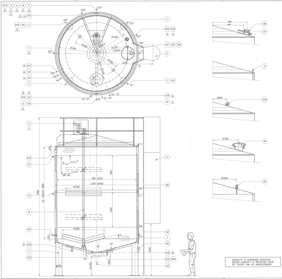Vertcial double jacketed insulated cream and milk storage and cooling tank. Nominal volume: 35.000 liter. Design pressure: atmosperic (tank) 4 bar (jackets). Design temperature: 100°C (tank and jackets). Topside driven multi-blade agitator, motor: 2,2 kW speed n2: 24 rpm. Insulated, side and bottom. With 2 x cooling sections: bottom 25 ltr and jacket 25 ltr. Previously used for cream storage and cooling via glycol from 8°C -> 4°C; capacity 0,5°C per hour. Product outlet 2,5" Hovap variflow pneumatic tank outlet valve. Outlet height: 80 and 94 cm. With cleanable Sample valve. In bottom 3 x sensor: temperature, pressure and level. High: 1x level. In top: sight glass and breather. 2 CIP spray bowls. Manhole in top, round +/- Ø 50 cm. 4 Adjustable feet. Inside dimensions of tank: Ø 320 cm and cylindrical lenght 386 cm. With stainless steel cage ladder mounted on side. Documentation inculding drawings available. Total dimensions: Ø 349 x 655 cm. Weight: ca. 4.100 kg.