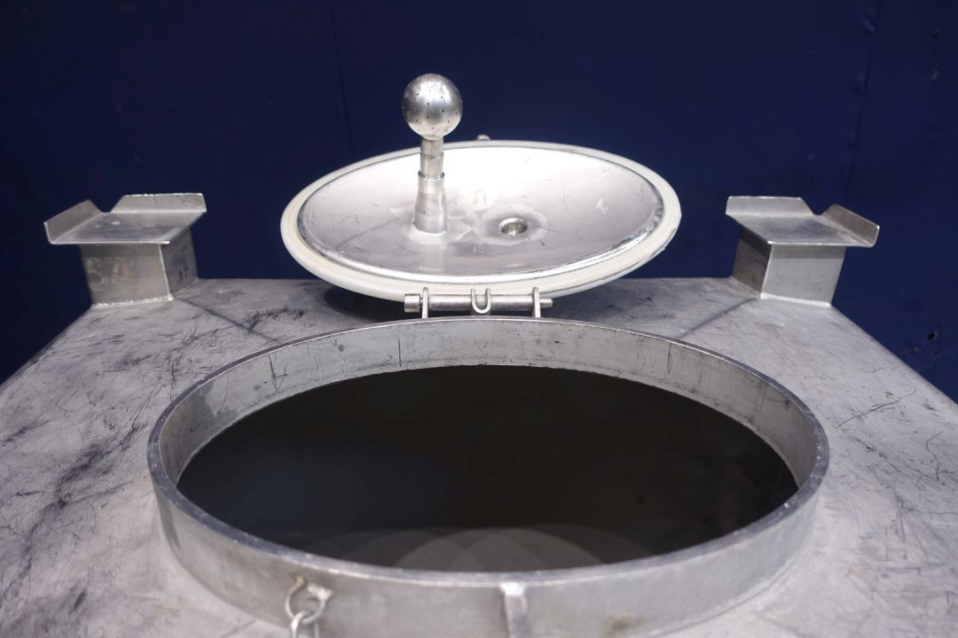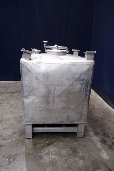 Square stackable transport tank, single jacketed. Product outlet 2" Din with manual butterfly valve and outlet height: 19 cm. Conical bottom to outlet. Product inlet on top, connection: 2,5" Din. 1 CIP spray bowl in manhole cover. Manhole in top/side, oval 44 x 30 cm. 4 Feet, SS transportframe. Inside dimensions of tank: lxbxh 105 x 105 x 105 cm. Total dimensions: 105 x 105 x 155 cm, Weigth 138 kg. Has some dents - signs of use.