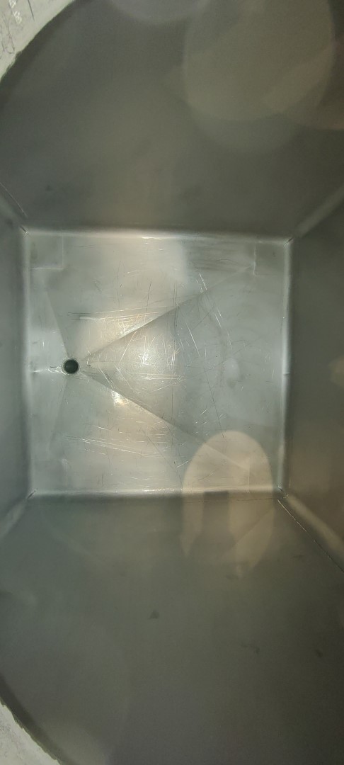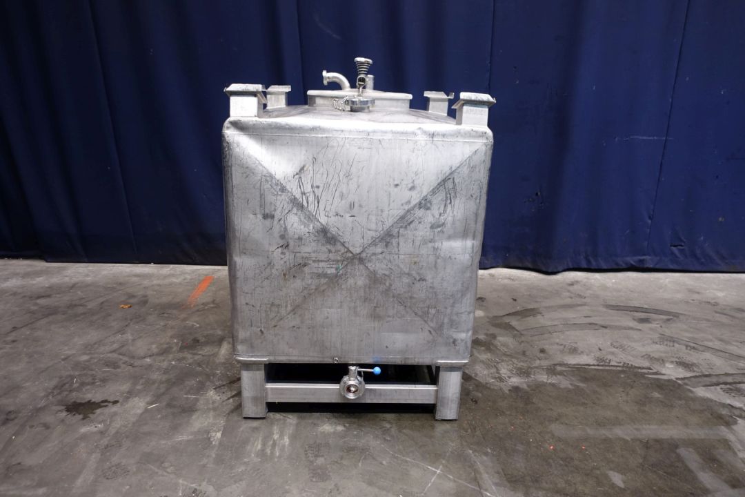 Square stackable transport tank, single jacketed. Product outlet 2" Din with manual butterfly valve and outlet height: 19 cm. Conical bottom to outlet. Product inlet on top, connection: 2,5" Din. 1 CIP spray bowl in manhole cover. Manhole in top/side, oval 44 x 30 cm. 4 Feet, SS transportframe. Inside dimensions of tank: lxbxh 105 x 105 x 105 cm. Total dimensions: 105 x 105 x 155 cm, Weigth 138 kg. Has some dents - signs of use.