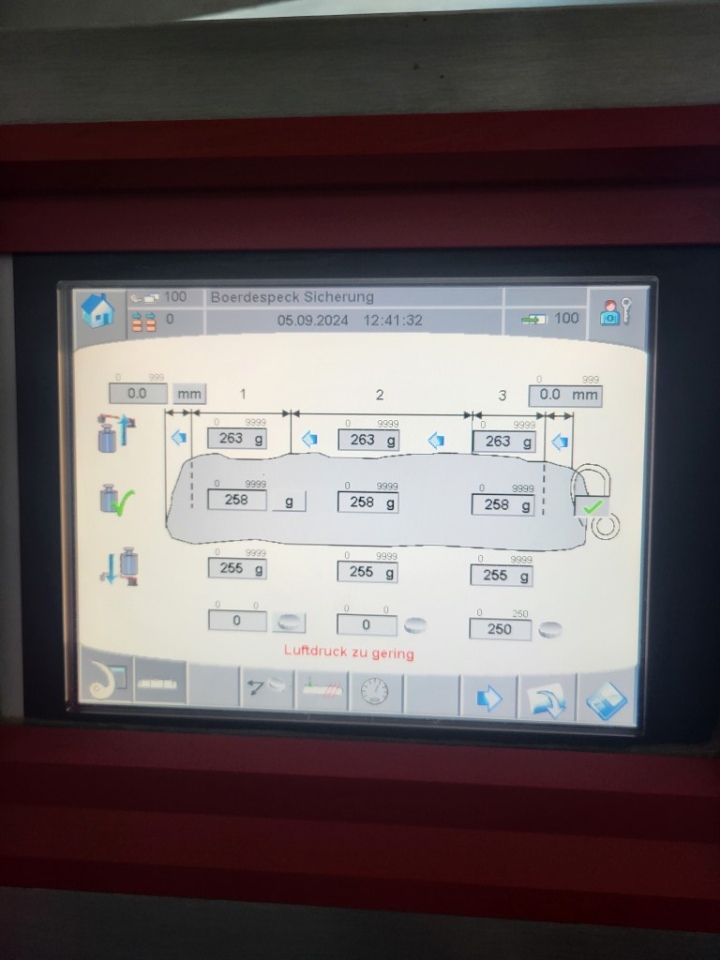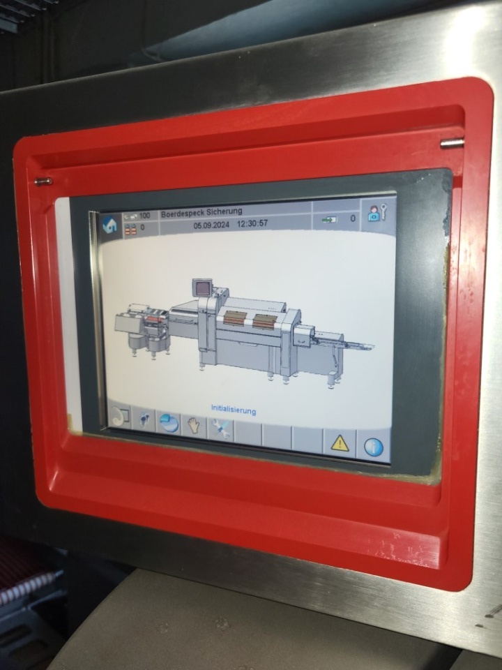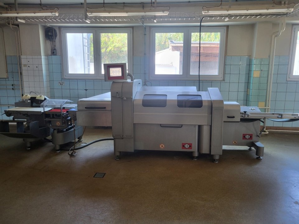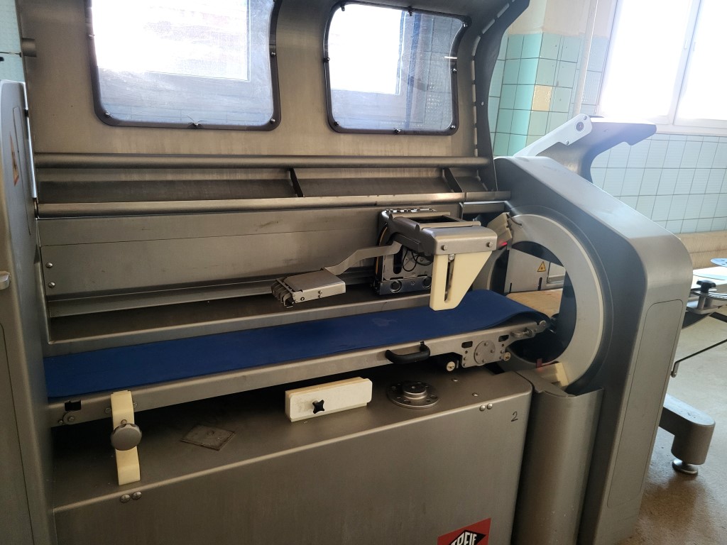 Fully automatic Portion Cutting machine. High-speed cheese or meat cutting / dicing / portion cutting / bread cutting machine by exact weight including checkweigher and sorting station with pusher. The portion is scanned and the machine automatically determines the length of the portion with high throughput. Based on nearly twenty years of experience in the area of cutting precisely weighed portions, TREIF developed the FALCON portion cutter. This Falcon has a digital display with touchscreen. Insertion cross section 260x155 mm / 220x155 mm, single length max. 1000 mm, application down to -4 °C. Power: 22A. Weight: 750kg.