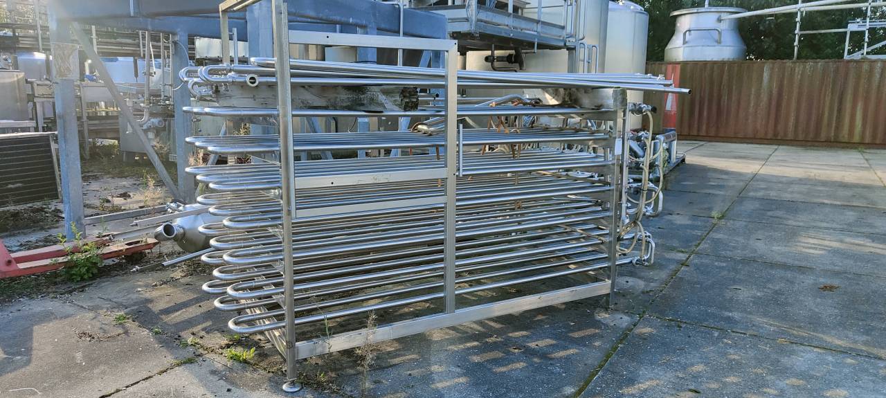Monotube, inner diameter (product) 23mm outer diameter (water) 40mm, 42 tubes x 3 mtr each. total dimensions: Length 3,00 mtr x Width 1,30 mtr, Height 1,50 mtr. On a stainless steel frame. Flexibel in using, many loops can be made.