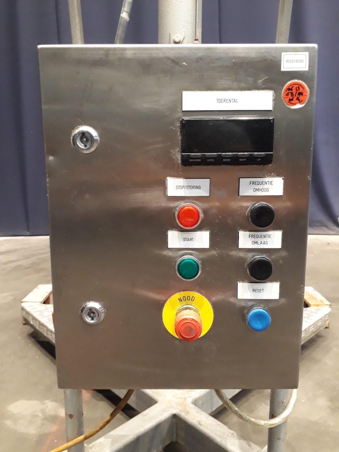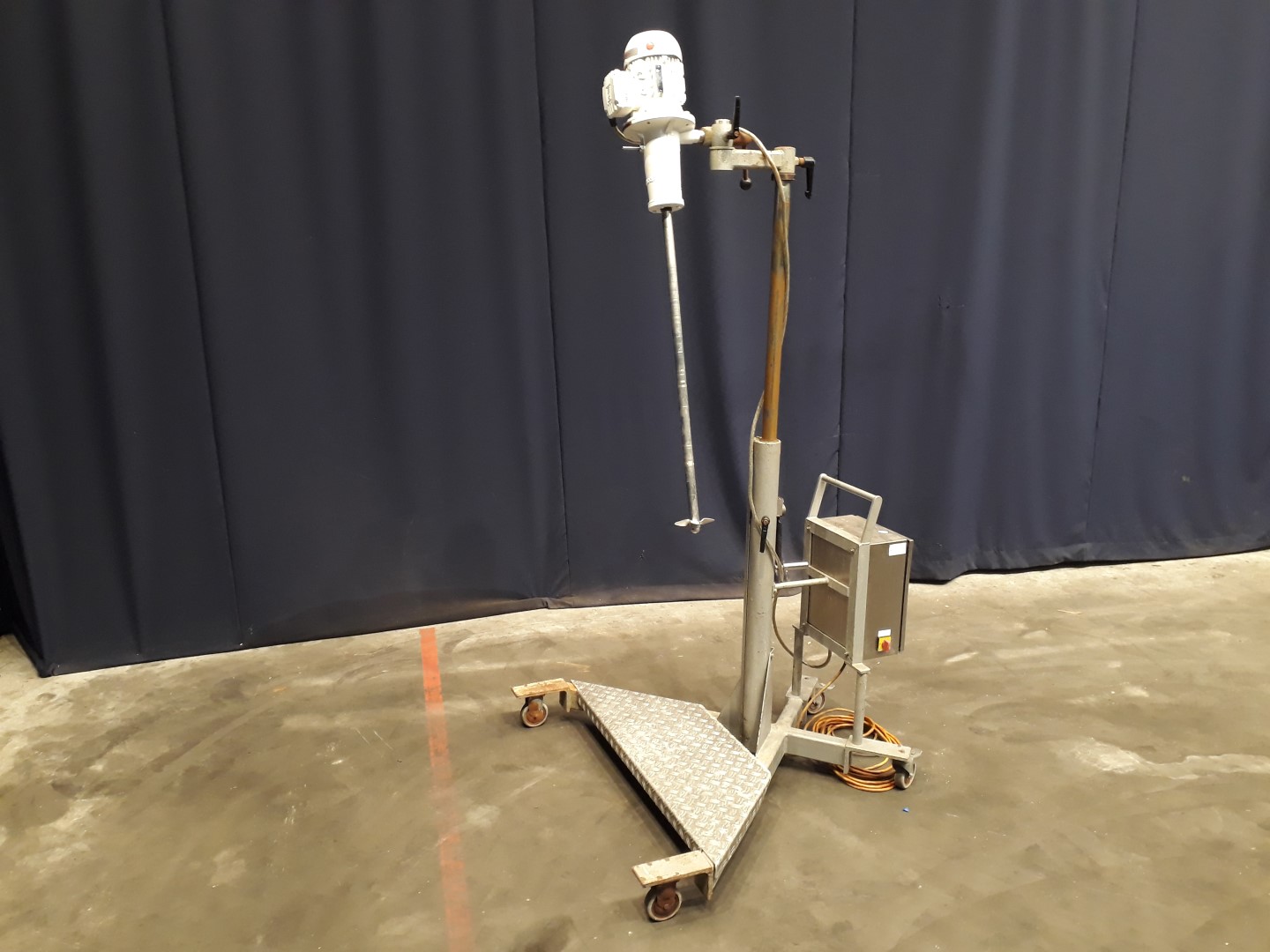 Propellor agitator on a mobile frame. Motor 0,75 kW - 1,88 A - 1380 rpm. Including control panel with Omron frequency converter and speed read out. Shaft length: 85 cm. 1 Propellor with 3 blades on the shaft. Propellor diameter: 130 mm. Angle and height adjustable (70 cm). Total dimensions: 120 x 130 x 165/235 cm.