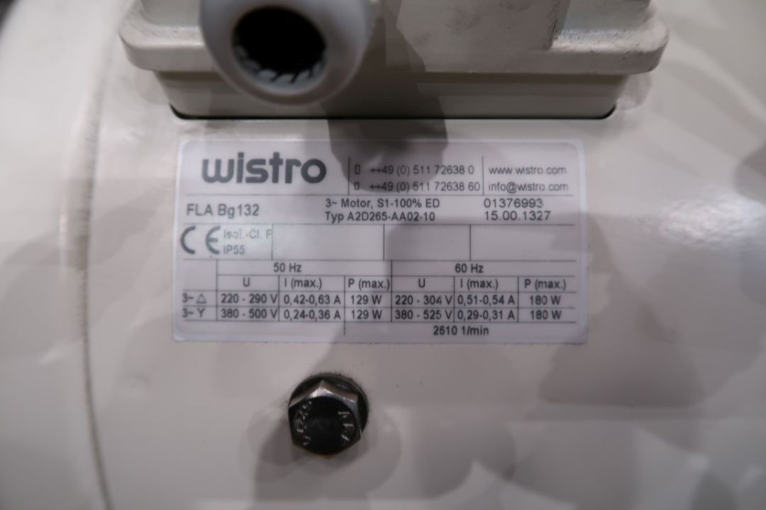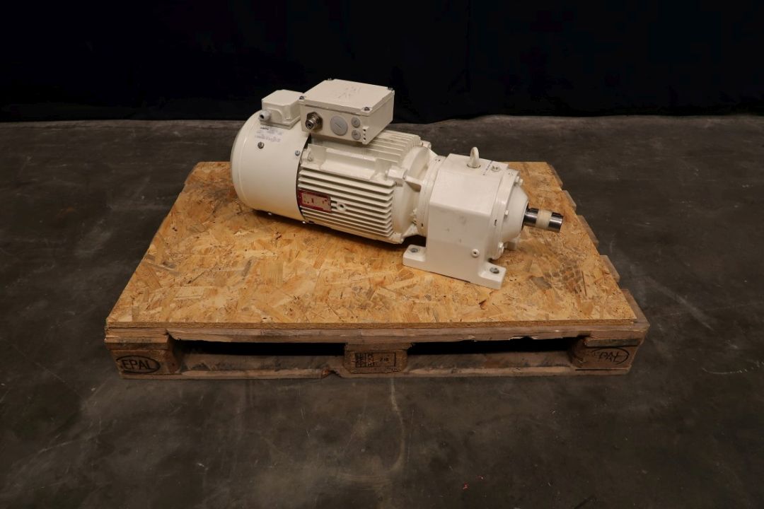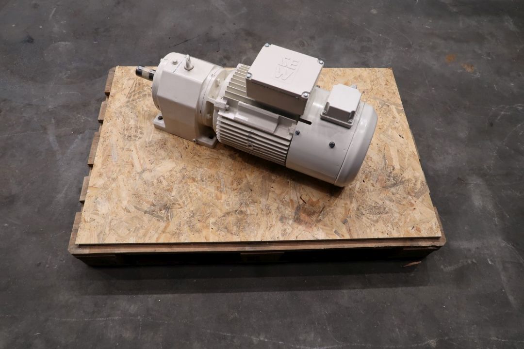 Electric motor with drivework. Motor: 7,5 kW - 349 rpm - 15,47 A - 50 Hz. Axle with spline. Forced air cooling Wistro A2D265-AA02-10. Total dimensions: 85 x 28 x 38 cm.