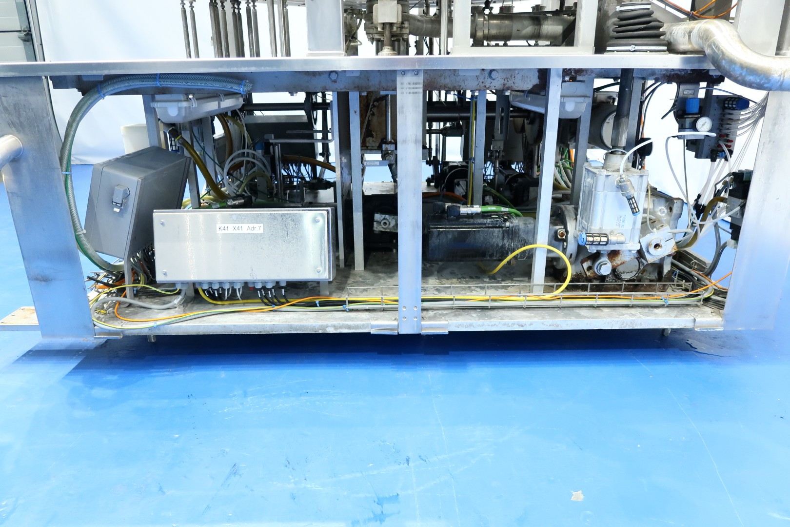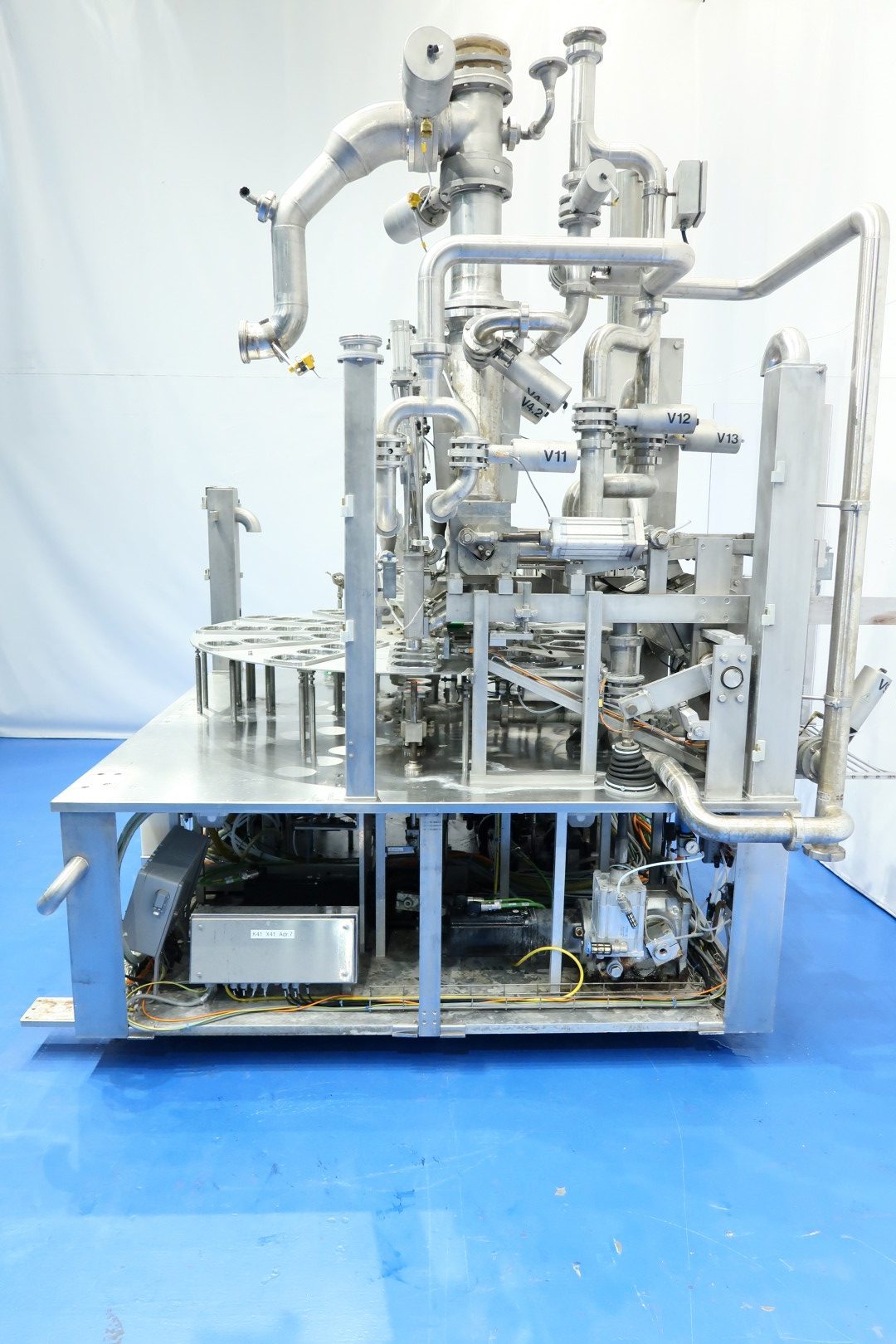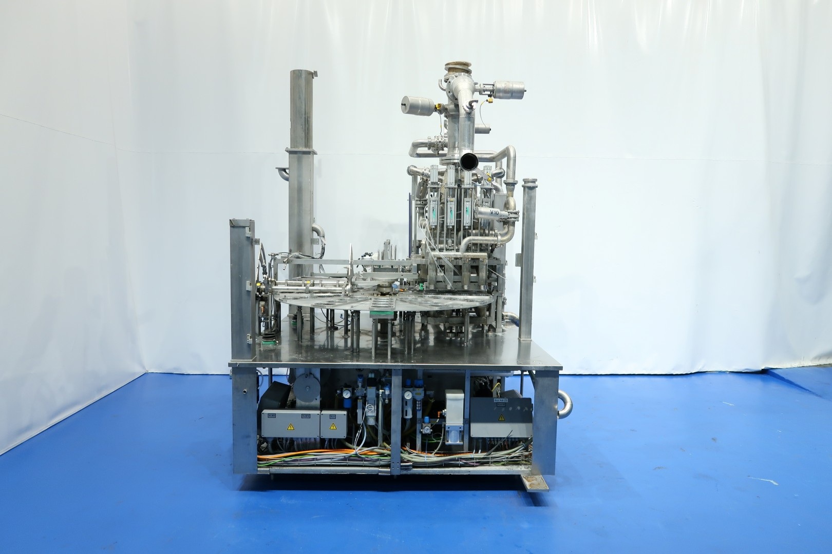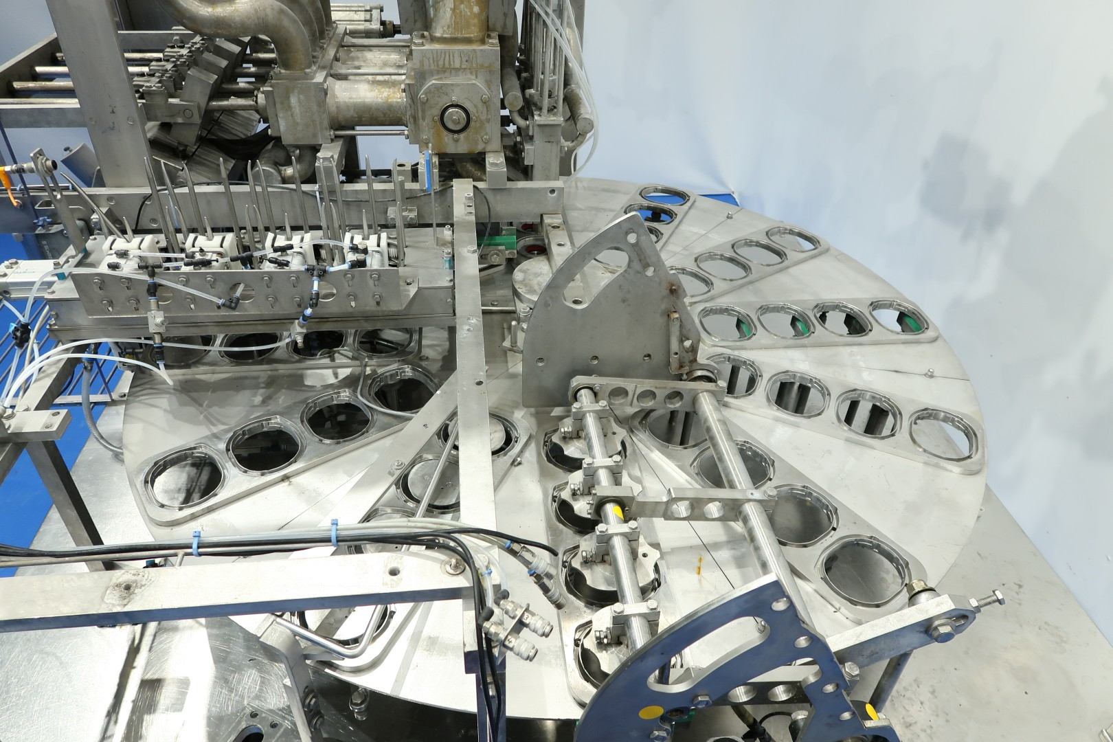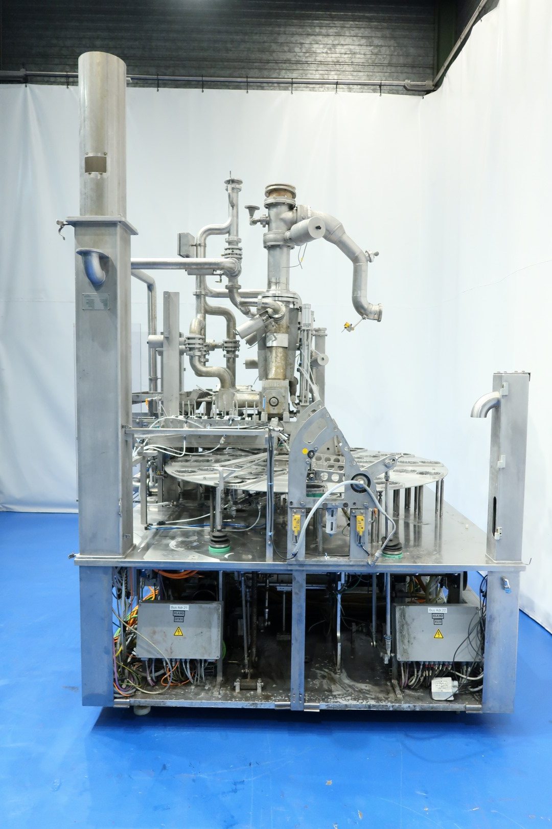 Rotary filling machine (incomplete), 4 head rotary. Doser Up to 1kg. With several servo drives for parts only. With direct connection to doser for viscose products like salads. infeed pipe pressure up to 8 bar. Total dimensions: 263x213x304 (lxwxh) cm - weight: 3.150 kg.