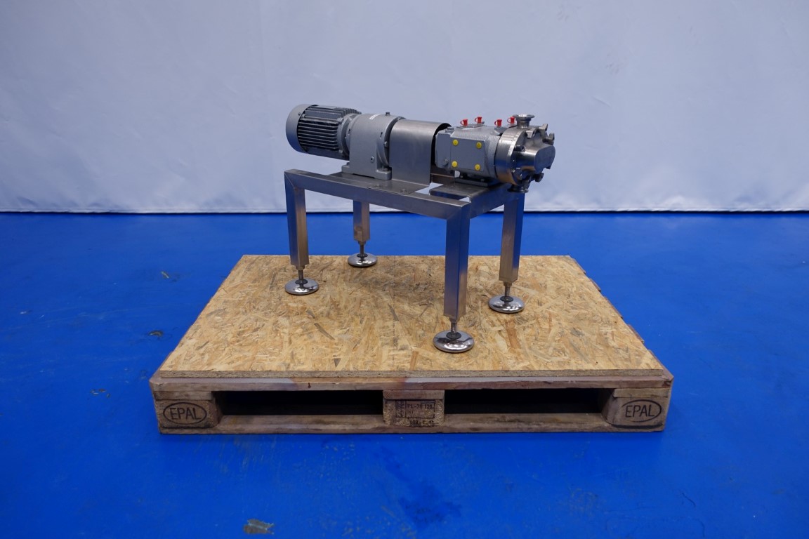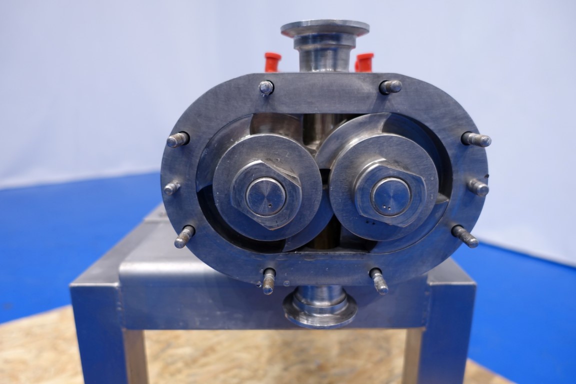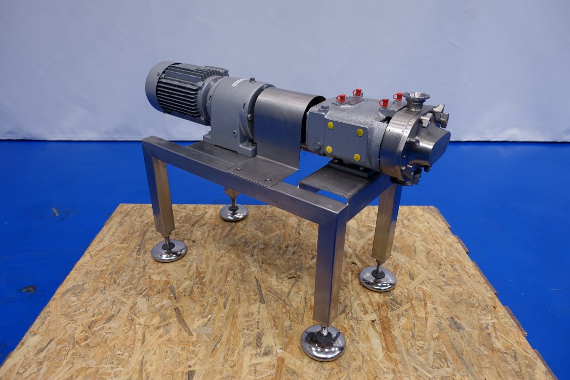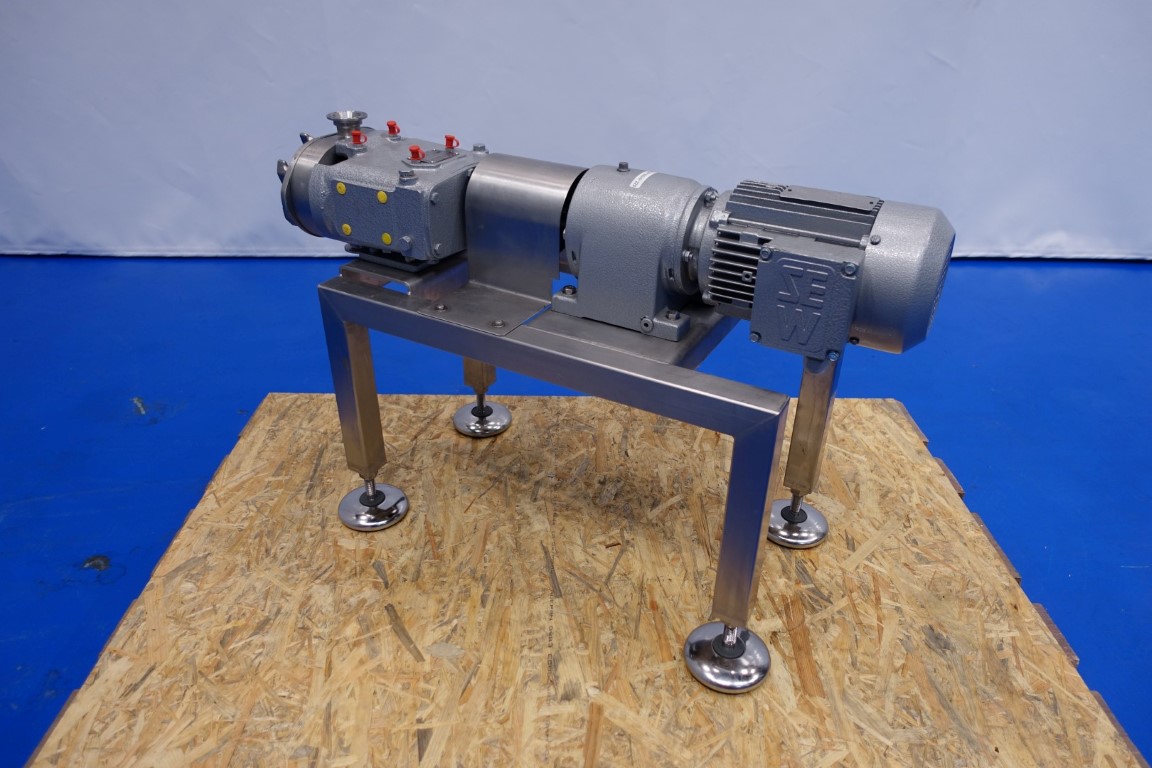 Reconditioned Waukesha lobe pump with duo lobbes, design pressure: 13 bar, 0,054 ltr/rotation, max speed 700 rpm, max capacity 2.268 ltr/h. Connections: inlet/outlet port: 1,5'' Tryclamp. Current gear: 0,75 kW - 2,10 Amp. N2: 165 rpm. Mounted on a stainless steel frame. Total dimensions: 80x32x53 (lxwxh) cm - weight: 89 kg's. Test report available.