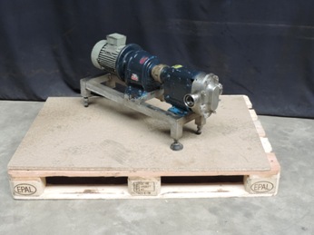 Duo lobbes, diameter 81 mm. Displacement per revolution: 0,12 ltr. Nominal capacity 7,5 m3/h. Pressure up to 13,8 bar. Connections: inlet/outlet: 38 mm DIN. Current motor: 0,75 kW - 1,95 A - n1: 1400 rpm, i=25, n2: 56 rpm. Frame mounted.