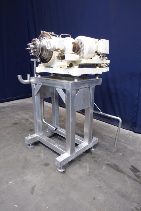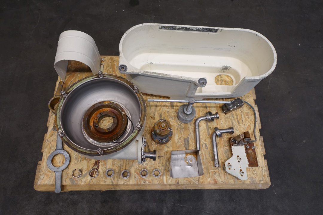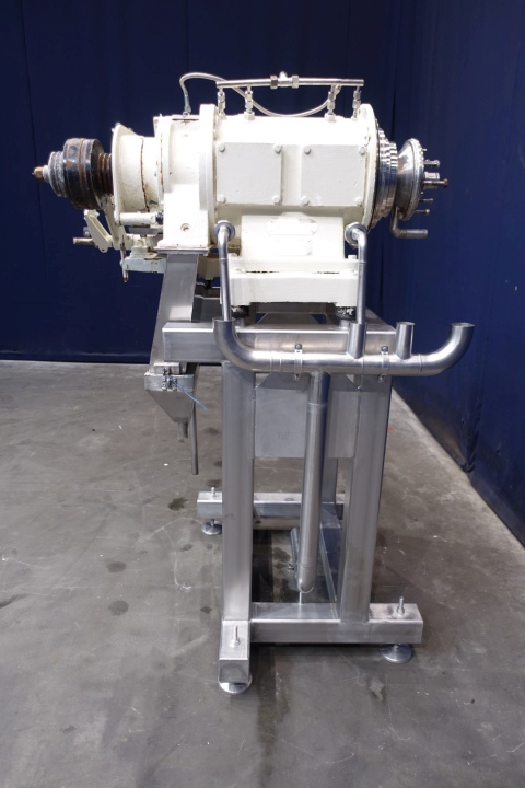 Decanter on SS frame. Speed 5.500 rpm. Motor: 11 kW - 22 A - 2.910 rpm. Previoulsly used for: Whey . Ø in mm 220/125 - Solid 2,5. Dimensions: 140x135x190 (lxwxh) cm, weight: 834 kg's. Machine not complete, some tools available. Documentation, folder with spare parts list and operatin manuel (in German and English) available.