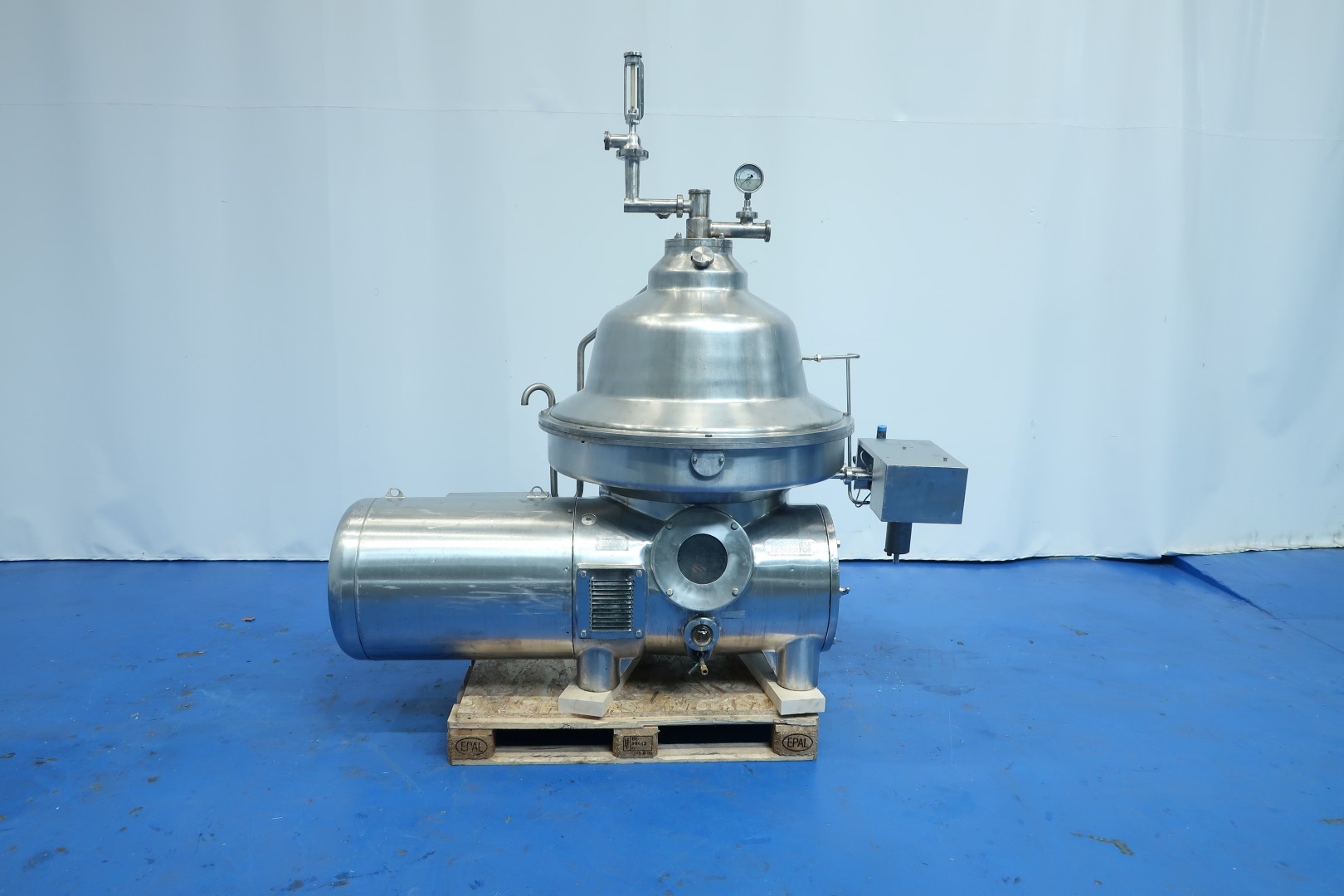 Milk/whey skimmer, self cleaning. Including bowl, motor cover, flowindicator cream and flow regulation valve, pressure indicator and OWM with pneumatic piston and fluid clutch. Bowl speed 4.500 rpm. Set of tools with ring key and pressing tool. Connections: 1x 3" SMS - 1x 2,5" SMS. Excluding: Base frame, CPM and controls, can be offered upon request. Dimensions: 210x110x220 (lxwxh) cm - weight: 1.217 kg.