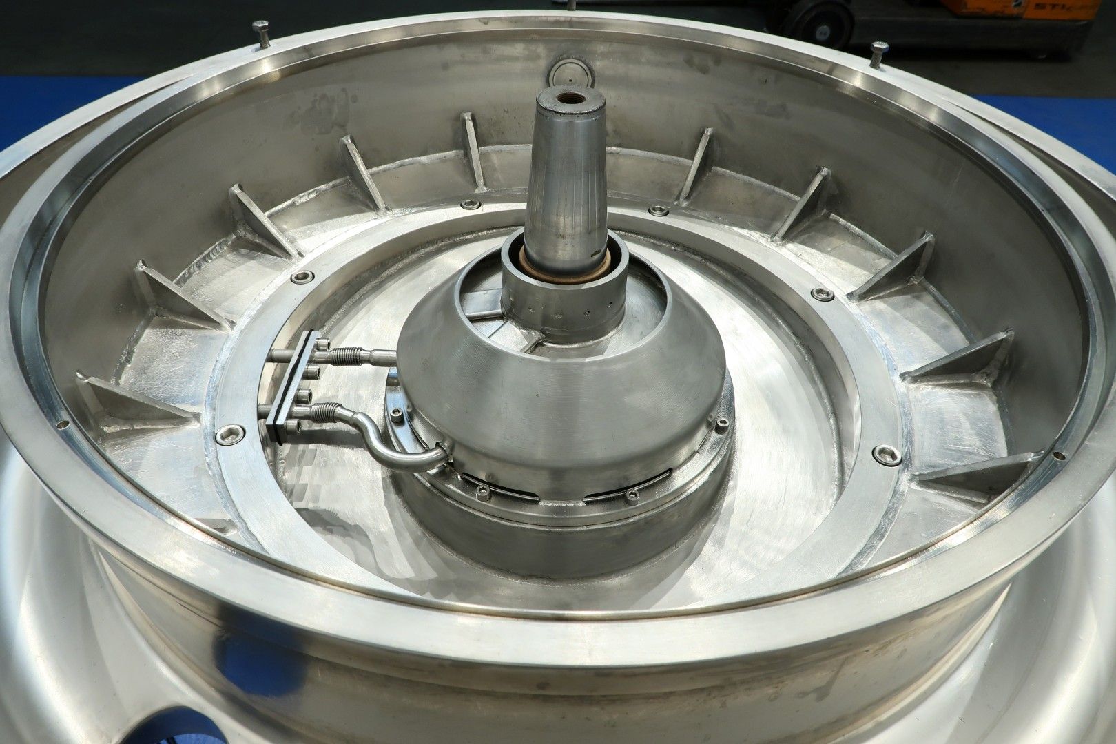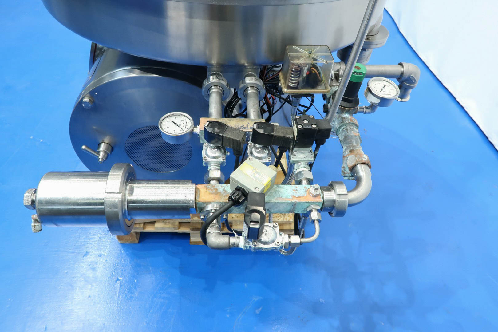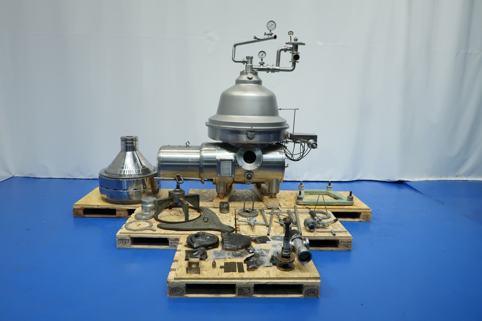 Milk skimmer, self cleaning. Including bowl, motor cover, base frame, Double activated pneumatic counter pressure valve milk Tetra CPM, Sample valve on outgoing cream and OWM. Motor 37 kW - 72 A - 50 Hz. With fluid clutch. Set of needed tools with ring key and pressing tool. Including some spare parts. Documentation: Instruction manual and parts list. excluding control box. Total dimensions: 215x95x220 (lxwxh) cm - weight: 1.399 kg (machine) total with all parts: 2.438 kg.