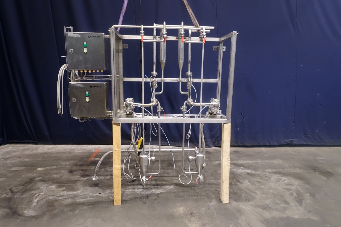 Lye dosing set. Membrane pump. GreyLogix DrinkTec controls. Total dimensions: 185 x 50 x 170 cm.